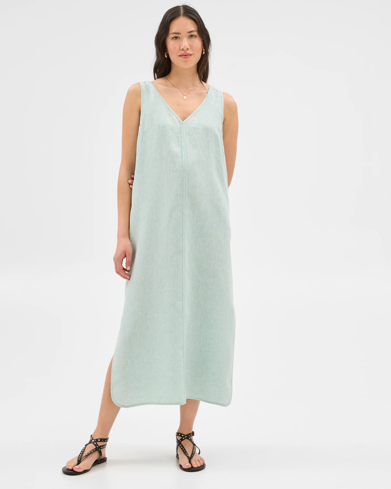 Discover effortless style with this European Linen Binding Cami Dress. Made from quality European linen, it ensures a comfortable and airy feel ideal for warmer days. With a v-neckline and sleeveless design, this dress offers both comfort and fashionable appeal. The binding along the neck, armholes, and hem adds a touch of distinction. The straight cut and midi length make it a versatile piece for any wardrobe. Large side seam splits add a contemporary flair, making it perfect for everyday wear or special occasions. Step out in comfort and style with this essential dress.