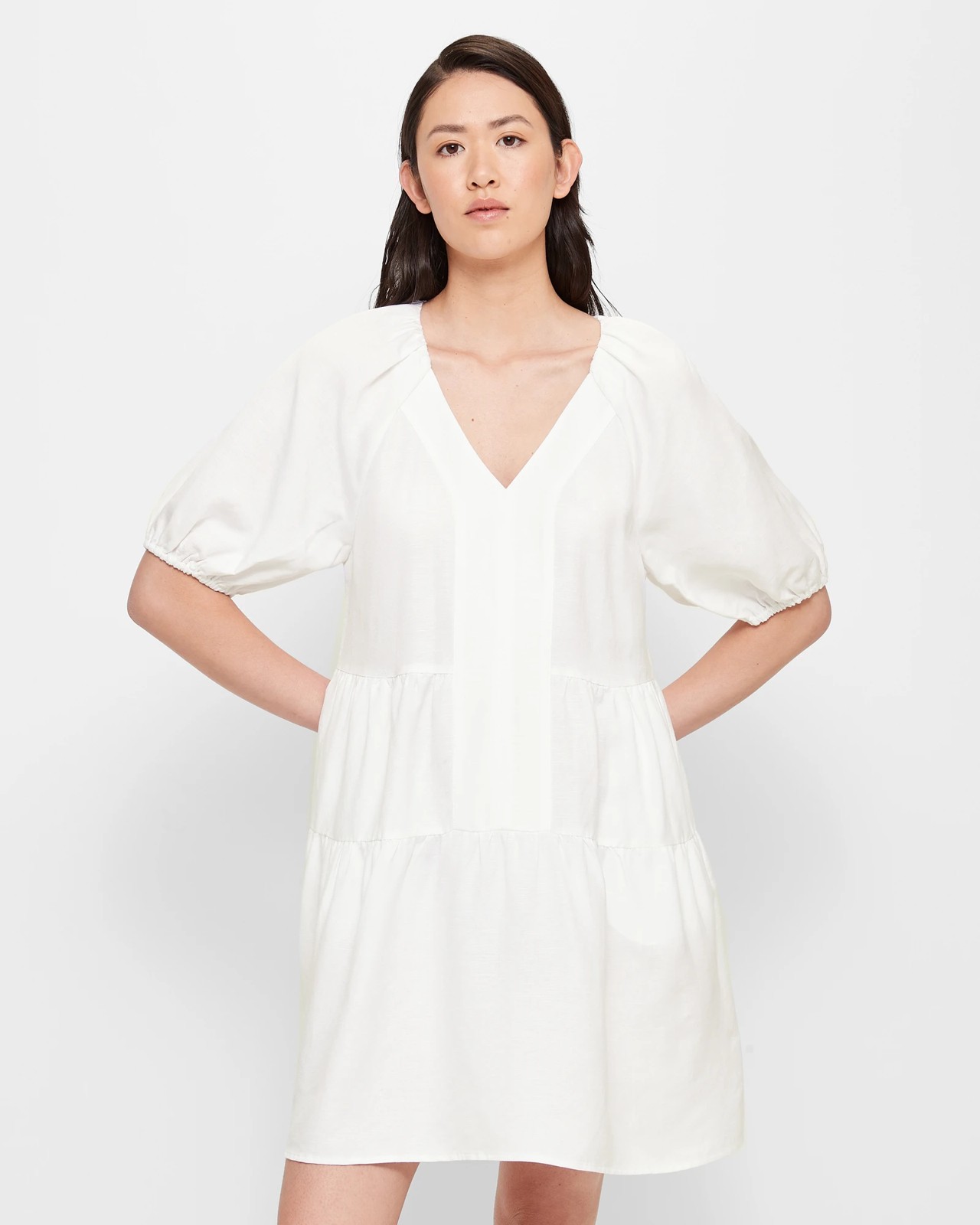 Introducing our European Linen Blend Blouson Mini Dress - a must-have for the stylish woman looking for effortless elegance. Made from a luxurious blend of European linen and viscose, this dress offers a regular fit that flatters any figure. The cloud dancer shade adds a touch of sophistication, while the V-neckline and gathering around the shoulders create a feminine silhouette. With short blouson sleeves and elastic cuffs, this dress exudes a sense of relaxed charm. The centre stitched panel and structured waist deliver a touch of refinement, while the side seam pockets offer practicality. Finished with tiered panels and a straight hemline, this mini dress is perfect for any occasion. Complete your wardrobe with this timeless piece today!