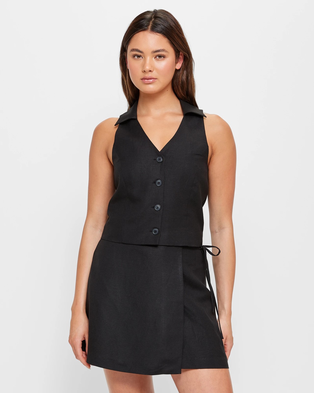 Enhance your wardrobe with the European Linen Blend Polo Waistcoat from Lily Loves. Crafted from a premium blend of European linen and viscose, this waistcoat offers a luxurious feel and comfortable fit. The waistcoat features a cotton lining and a regular fit, ensuring maximum comfort throughout the day. With its elegant black colour and V-collared neckline, this versatile piece can easily be dressed up or down. The sleeveless design and thick shoulder straps add a stylish touch, while the button-through front and tailored panels offer a flattering silhouette. Complete your outfit with this waistcoat and make a fashion statement wherever you go!