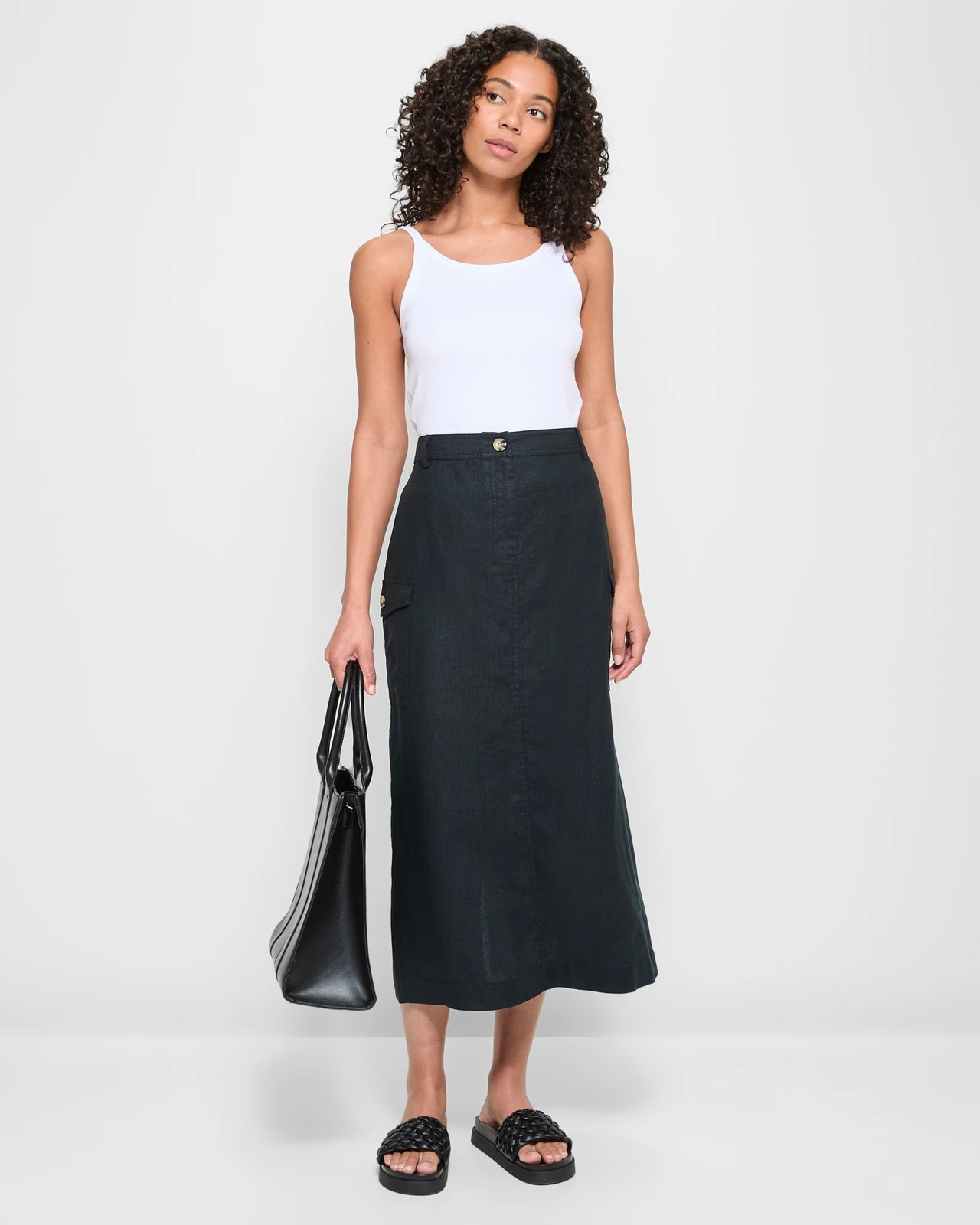 Discover the perfect blend comfort and style with our European Linen Cargo Maxi Skirt. Designed for your utmost convenience, this skirt features a breathable linen fabric that is light and airy. The structured waistband with belt loops ensures a well-fitted look, complemented by a front button and zip closure for an elegant finish. With practical side cargo pockets, you'll have plenty room for essentials on the go. The elegant maxi length adds a timeless appeal, while the back centre split allows for easy movement. Embrace sophistication and comfort in one chic piece. Get yours now and enjoy a new wardrobe favourite!