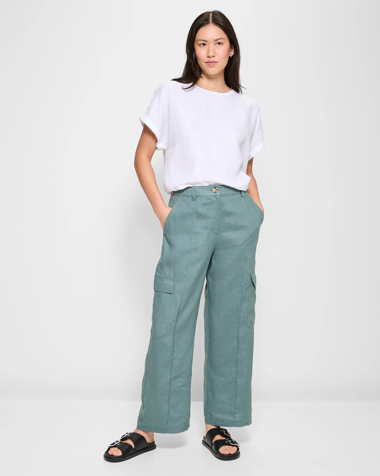Discover the perfect blend of style and comfort with our European Linen Cargo Trousers. Designed for the modern woman, these trousers are lightweight and breathable, made from fine linen that promises a relaxed fit. Featuring a classic cargo design with functional side and thigh pockets, they're both stylish and practical. The flat waistband with belt loops and the button and zip closure add a chic touch, while the pleated dart detailing down the front makes them effortlessly chic. These trousers are ideal for any occasion, ensuring you look great and feel comfortable all day long.