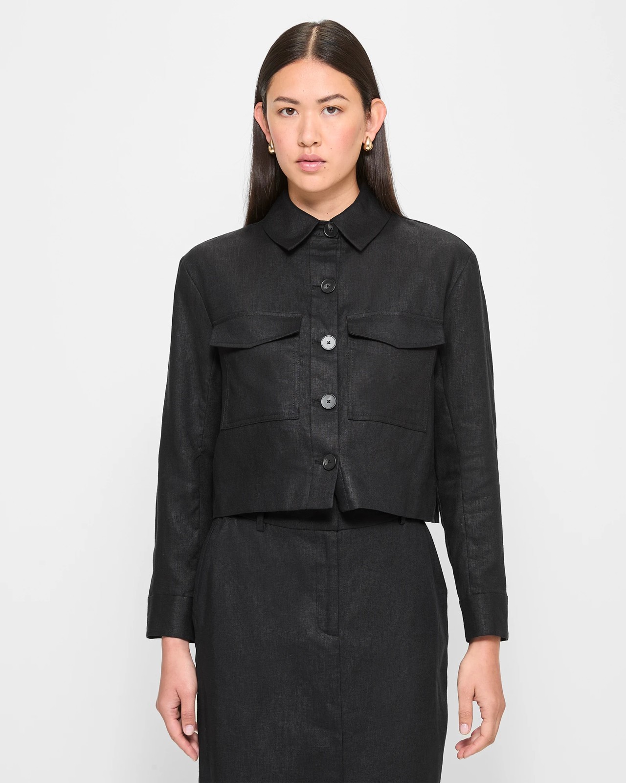 Discover effortless style with our European Linen Crop Utility Blazer. Designed with European linen and lined with soft polyester, this blazer is the perfect addition to your wardrobe. Light and breathable, it features a regular fit with a round collared neckline and button-through front. The long button cuff sleeves and large fold-over top chest utility pockets add a touch practicality. Its crop length and straight hemline give it a modern look that pairs beautifully with matching trousers (sold separately). Elevate your everyday style and make a chic statement.