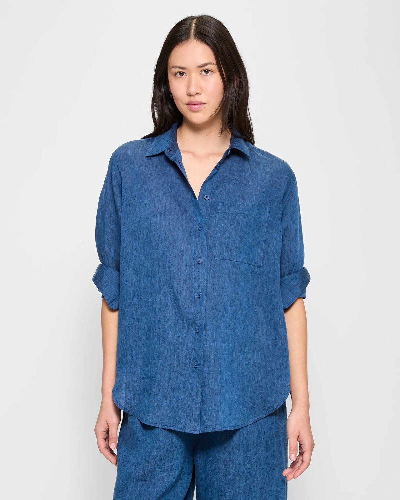 Step into comfort with our European Linen Shirt. The shirt is tailored from a lightweight and breathable linen fabric that offers comfort throughout the day. The classic design incorporates a round collared neckline, button-through front, and elegant cuffed sleeves for a refined look. The open chest pocket adds a touch of practicality, while the curved hemline enhances the overall style. With a perfect blend of style and sophistication, our European Linen Shirt is a must-have addition to your wardrobe. Elevate your everyday look with our effortlessly chic shirt!
