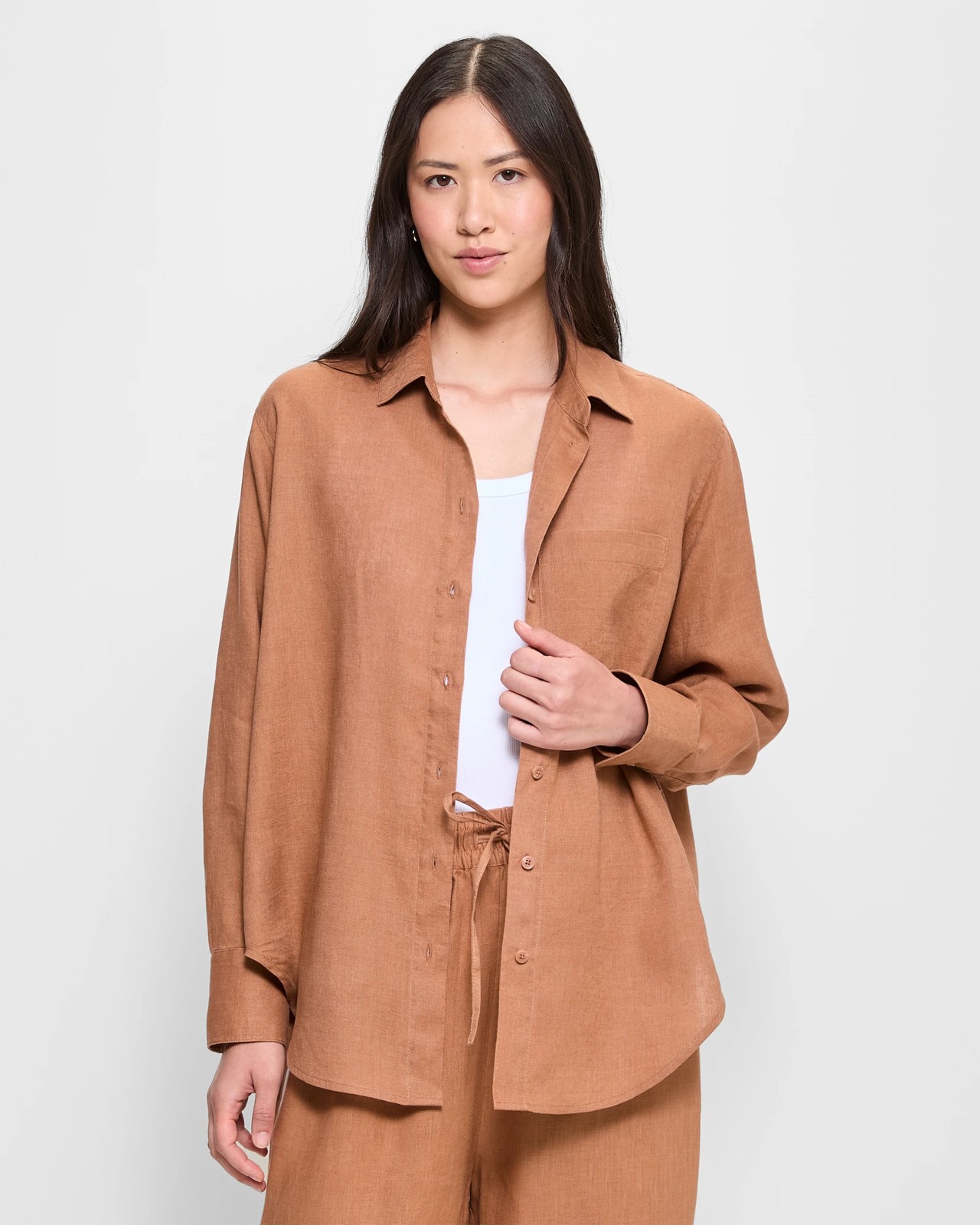 Enjoy the ideal combination of comfort and style with our European Linen Long Sleeve Shirt. Designed from high-quality linen, this shirt offers a gentle feel on your skin while maintaining a regular fit. Its tan brown colour, round collared neckline, and long button cuff sleeves make it perfect for both casual and work settings. Featuring an open chest pocket and a curved hemline, this shirt adds a touch of effortless chic. Add this essential piece to your collection now!