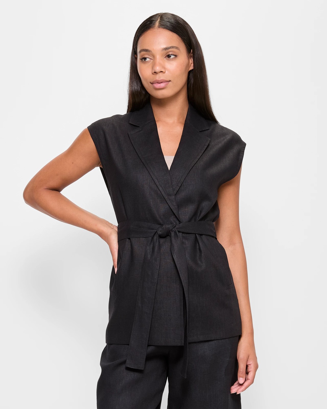 Discover the European Linen Longline Sleeveless Jacket, designed to offer a blend of style and comfort. Made from high-quality European linen and fully lined with polyester, this jacket ensures a light and airy feel. Its tailored fit, along with an open front and removable tie belt, provides versatility for any setting. Featuring side pockets and a straight hemline, this piece combines functionality with sophistication. Perfect for enhancing your wardrobe and making a statement wherever you go.