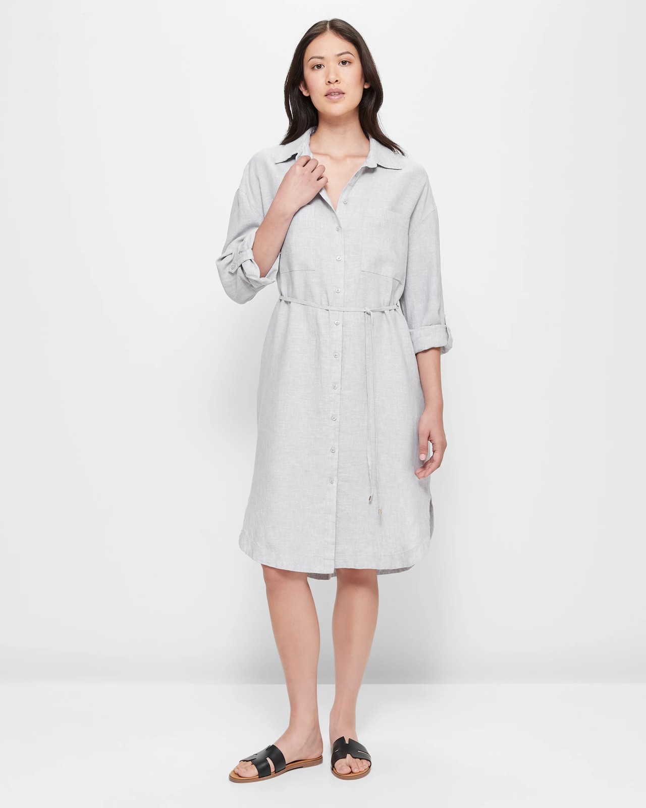 Step up your summer wardrobe with this lightweight and breathable European linen midi shirt dress from Target Woman. The regular fit design features a round collared neckline, button through front, long button cuff sleeves and a removable tie waist belt with side seam belt loops. Open chest pockets and side seam pockets add practicality to the look, while the curved hemline creates a flattering silhouette. Perfect for any occasion, this midi length shirt dress is sure to be your go-to for summer days out.