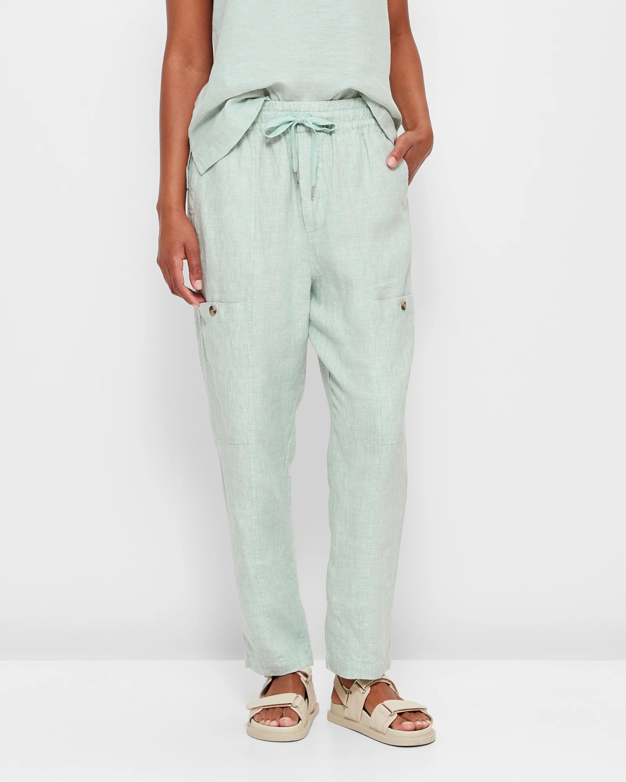 A feminine and relaxed fit, the pull on cargo pants will flatter every shape and size. They are made from a beautiful European linen material and has a thick elastic waistband for easy pull on, side pockets and front cargo pockets for your essentials and have a high rise waist and a cropped leg length. A must have for any summer wardrobe!