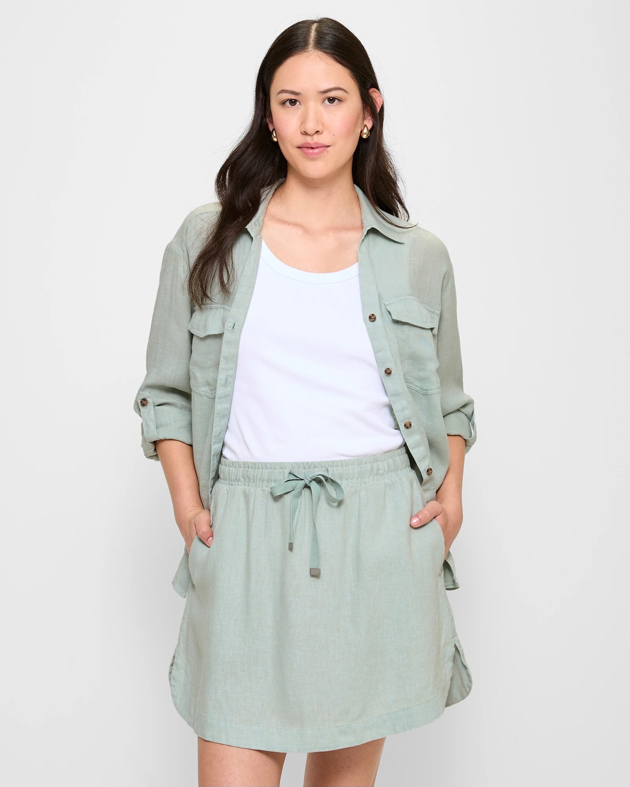 Indulge in the elegance of our European Linen Pull On Mini Skirt. Crafted with exquisite European linen, feel light and airy all day long. The regular fit and mini length offer comfort and style, while the thick elastic waistband and drawstring ensure a perfect fit. With practical side seam pockets and a trendy mermaid hem, elevate your look effortlessly. Embrace sophistication with every step you take.