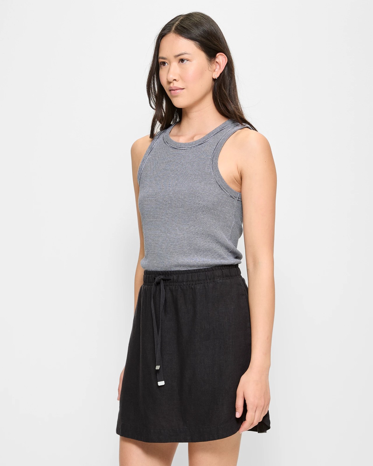 Indulge in the elegance of our European Linen Pull On Mini Skirt. Crafted with exquisite European linen, feel light and airy all day long. The regular fit and mini length offer comfort and style, while the thick elastic waistband and drawstring ensure a perfect fit. With practical side seam pockets and a trendy mermaid hem, elevate your look effortlessly. Embrace sophistication with every step you take.
