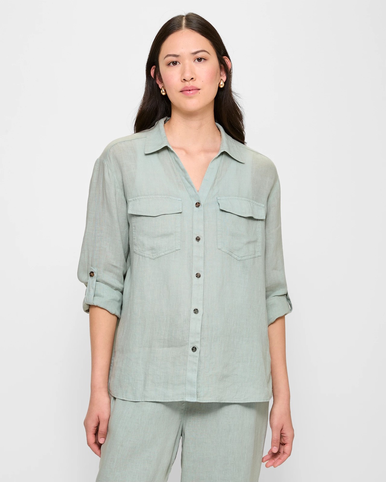 Indulge in the elegance of the European Linen Roll Cuff Shirt. Crafted from high-quality linen, embrace the lightweight and breathability of the fabric. Featuring a classic round collared neckline with a chic v-front drop, button through front, and stylish long roll cuff sleeves with button tab closure. Complete with practical chest fold over top pockets, a high-low curved hemline, side seam splits, and a back centre pleat for added movement. Elevate your wardrobe with comfort and sophistication - make a statement with every wear!