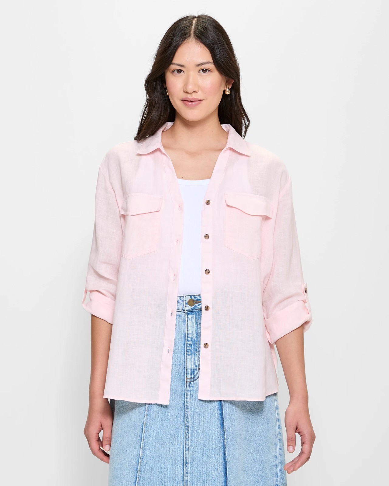 Indulge in the elegance of the European Linen Roll Cuff Shirt. Crafted from linen, embrace the lightweight and breathability of the fabric. Featuring a classic round collared neckline with a chic v-front drop, button through front, and stylish long roll cuff sleeves with button tab closure. Complete with practical chest fold over top pockets, a high-low curved hemline, side seam splits, and a back centre pleat for added movement. Elevate your wardrobe with comfort and sophistication - make a statement with every wear!
