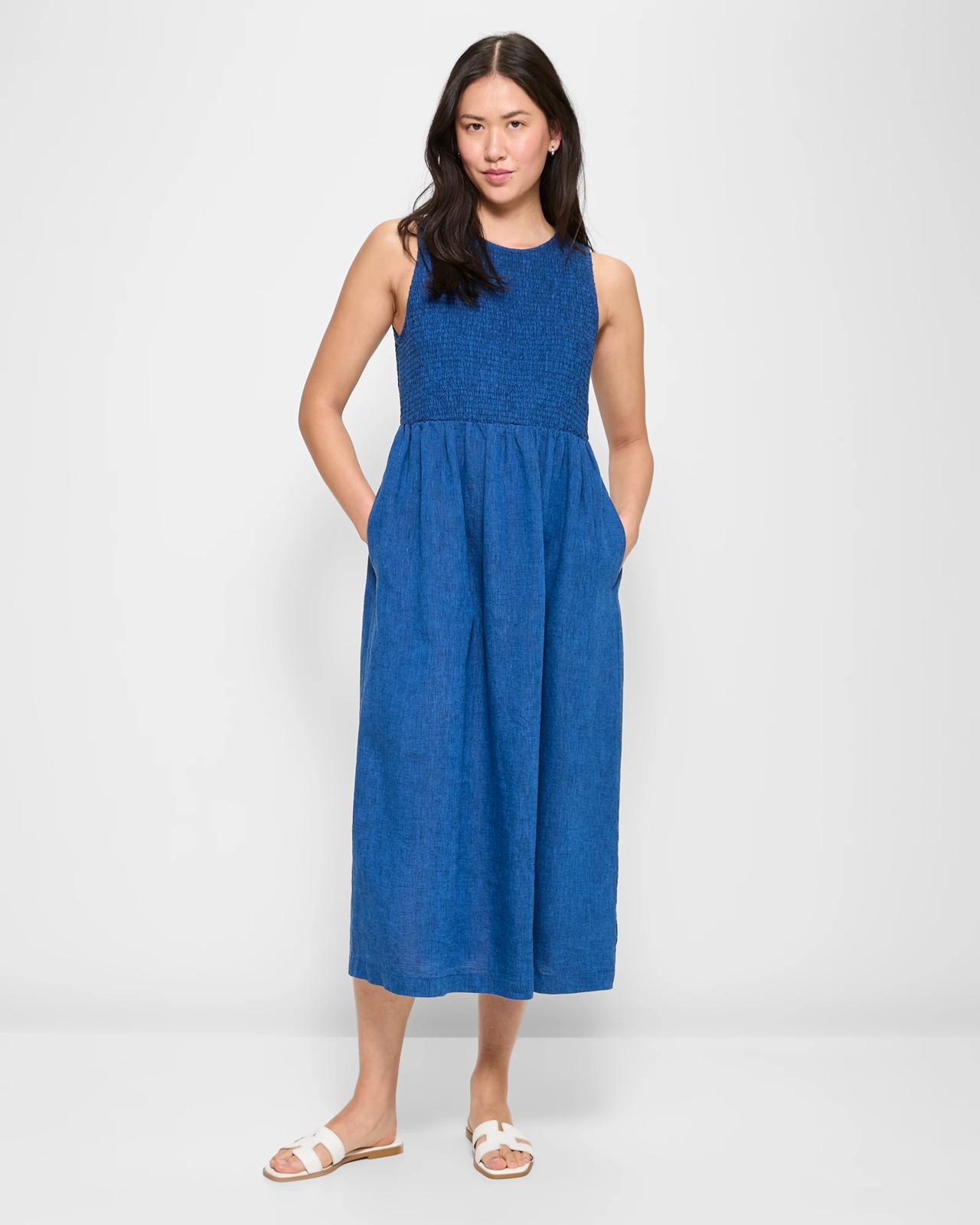 Bring a touch of sophistication to your wardrobe with our European Linen Shirred Bodice Midi Dress. Made from quality European linen, this lightweight and breathable dress ensures you stay comfortable all day. It features a comfortable fit with a round neckline, sleeveless design, and wide shoulder straps. The shirred bodice and structured waist create a beautiful shape, and the gathered fabric under the waist flows gracefully to its midi length. Practical side seam pockets and a back button closure with keyhole add functional elegance. Make this dress your go-to for any occasion.