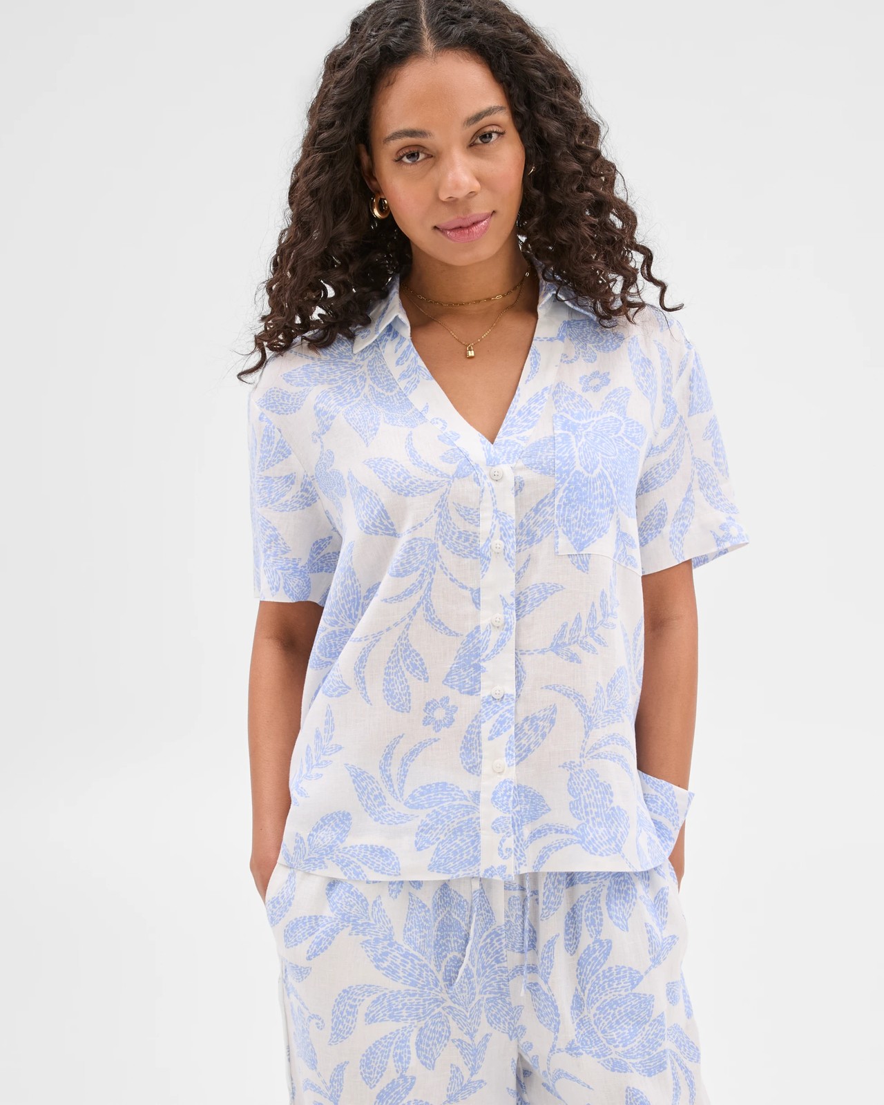 Discover the allure of our Women's European Linen Shirt. Made from high-quality linen, it promises a light and airy feel perfect for any season. The shirt's regular fit and round collared neckline with a V-drop combine style and comfort effortlessly. Featuring short sleeves, a buttoned front, an open chest pocket, a straight hemline, and side seam splits, this shirt is designed to be both functional and fashionable. Add this timeless piece to your wardrobe and enjoy a chic and comfortable look.