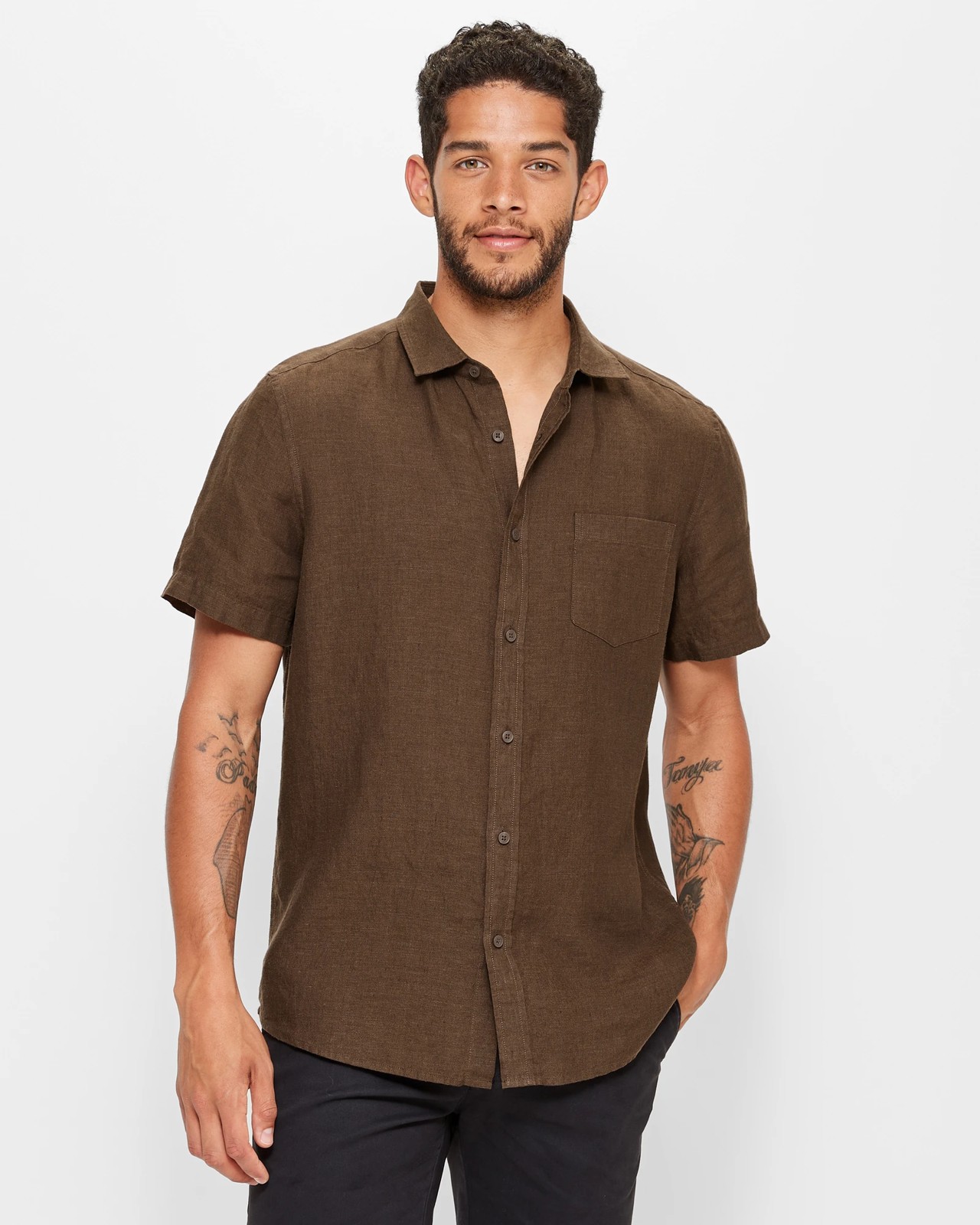 Look effortlessly chic in this stylish linen shirt. Crafted to perfection with a collared neckline, button down front and single chest pocket, this timeless piece is perfect for any occasion. The short sleeves and curved hemline give it a relaxed yet sophisticated look, while the back centre pleat gives it an extra touch of class. Whether you’re dressing up or dressing down, this linen shirt is sure to make you stand out in style.
