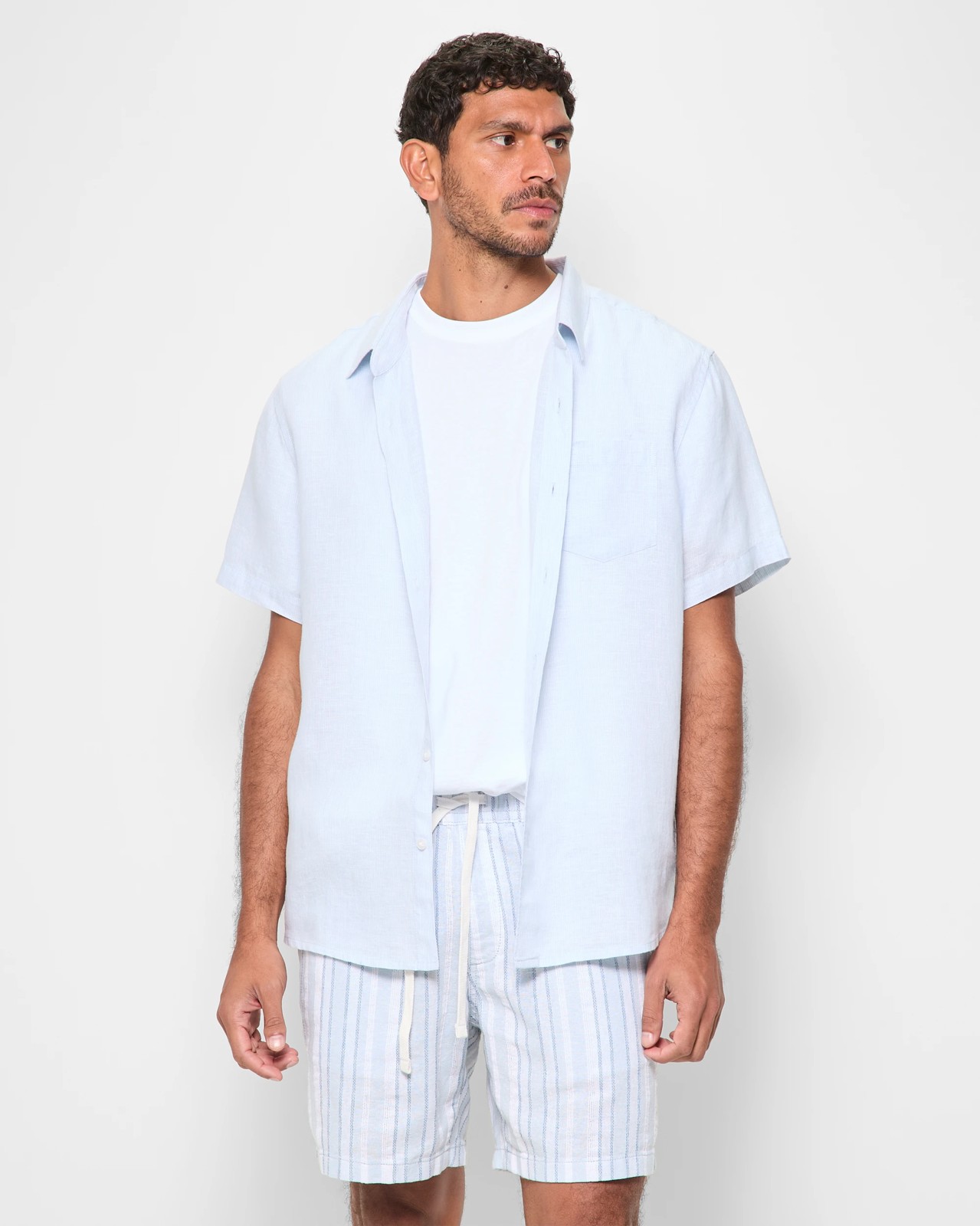 European Linen Short Sleeve Shirt - Microstripe Light Blue