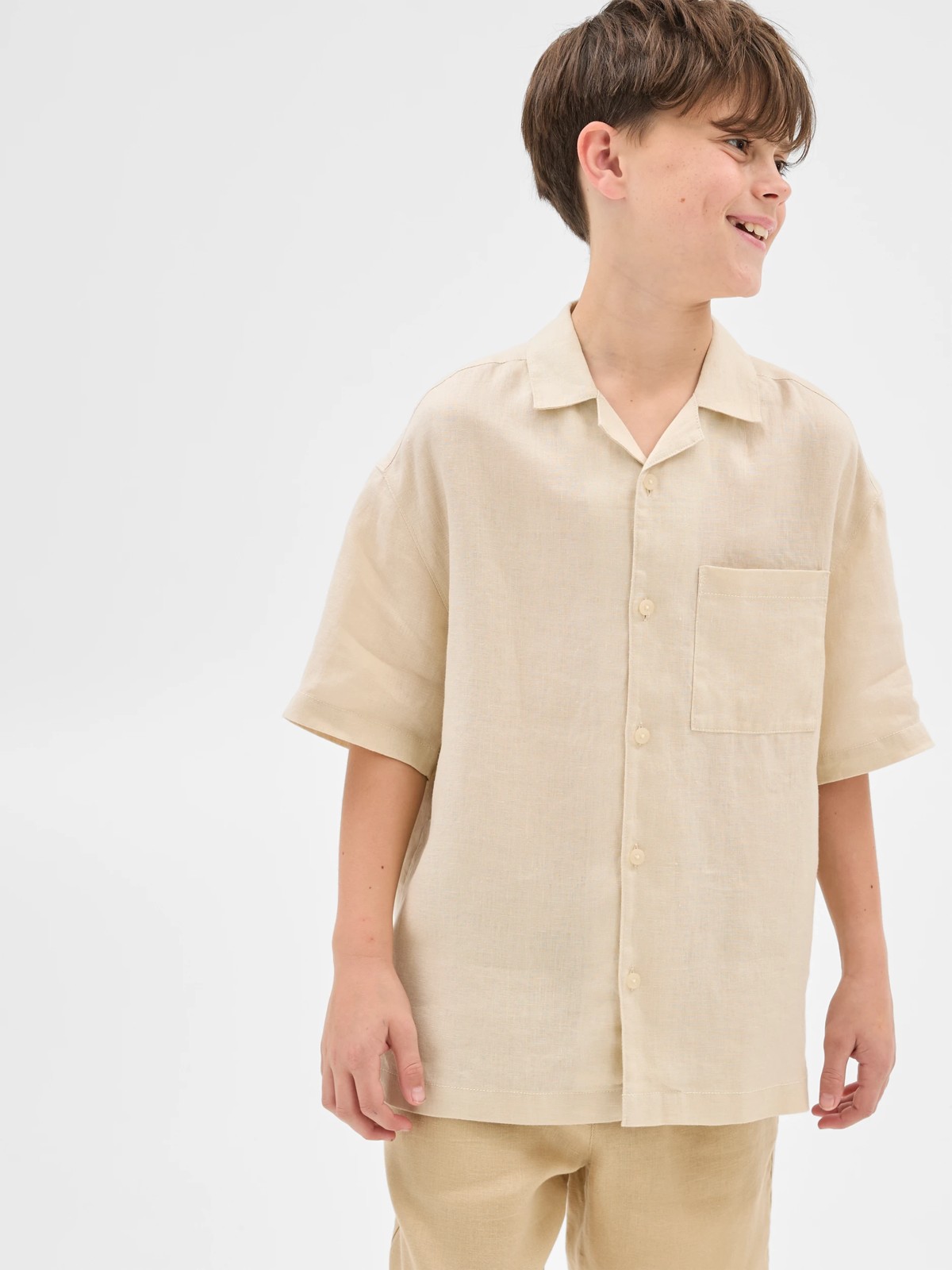Elevate your young man's wardrobe with this European Linen Short Sleeve Shirt, designed for both comfort and style. Crafted from European linen, this shirt features a lightweight fabric weight of 160gsm, ensuring breathability on warmer days while maintaining an effortlessly polished look. The classic collared neckline and short sleeves provide a timeless silhouette that is perfect for casual outings or special occasions alike. A front patch pocket adds a touch of utility without compromising the shirt's sophistication, while the button-through front allows for easy dressing and versatility in styling. Pair this shirt with shorts or chinos for a stylish outdoor look, or dress it up with slacks for family gatherings. With its regular fit and straight hemline, it fits comfortably for active days. Choose this shirt to give your boy a confident and stylish appearance, making him stand out in any setting.