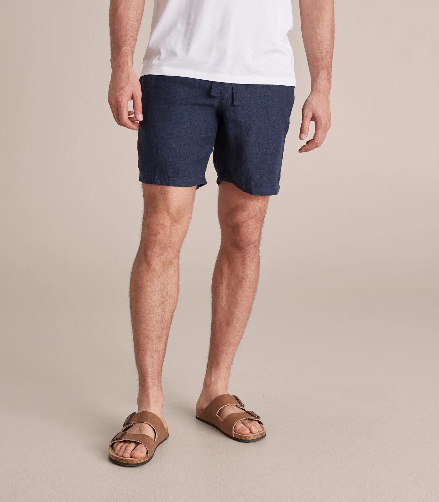 The mens linen shorts are made from a breathable and lightweight linen fabric. They feature an elastic drawstring waist, mock fly front and buttoned back pockets.