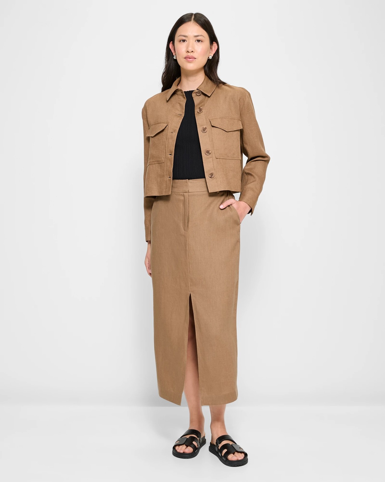 European Linen Tailored Front Split Midi Skirt - Preview