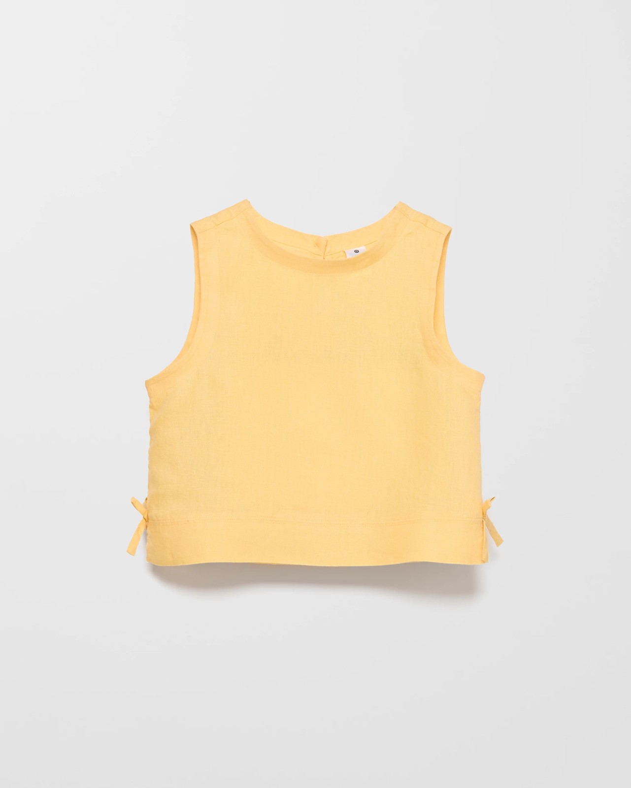 Treat your young one to the wonderful feel of the European Linen Tank, designed with playful self bows at the sides for a delightful touch. The lightweight linen keeps her feeling cool and comfortable during warm days, while the round neckline and straight side-split hem add a dash of effortless style. Getting dressed is made simple thanks to the sweet keyhole button at the back. Perfect for layering or wearing alone, this tank is sure to bring a smile to her face and confidence to her step. Add it to her collection today and see her enjoy every moment.