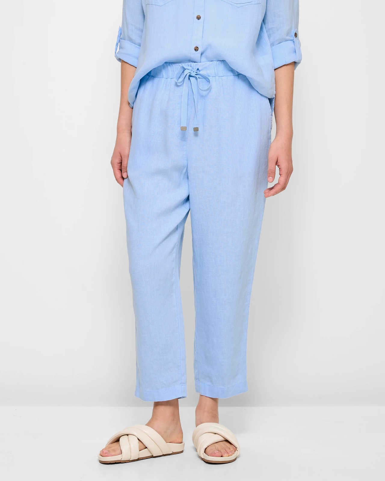 Step into style and comfort with our European Linen Tapered Pants. Crafted from high-quality European linen, these casual pants offer a perfect blend of sophistication and ease. The regular fit and thick elastic waistband with a drawstring ensure a snug yet flexible feel. Featuring a mock zip fly front and side pockets for added convenience. The tapered leg design with a cropped length and straight hemline exudes a modern chic vibe. Elevate your everyday look with these versatile trousers.