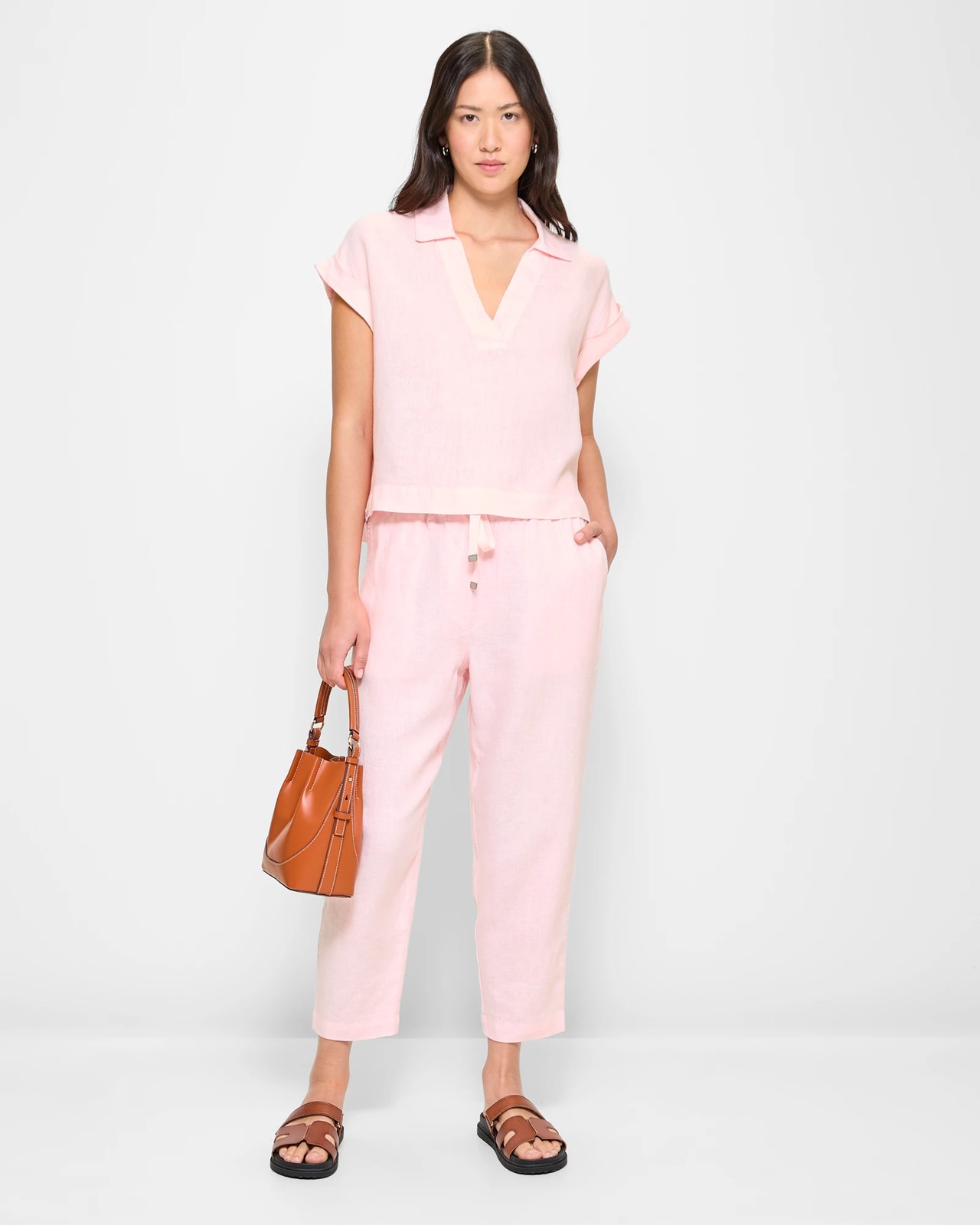 Step into style and comfort with our European Linen Tapered Pants. Crafted from European linen, these casual pants offer a perfect blend of sophistication and ease. The regular fit and thick elastic waistband with a drawstring ensure a snug yet flexible feel. Featuring a mock zip fly front and side pockets for added convenience. The tapered leg design with a cropped length and straight hemline exudes a modern chic vibe. Elevate your everyday look with these versatile trousers.
