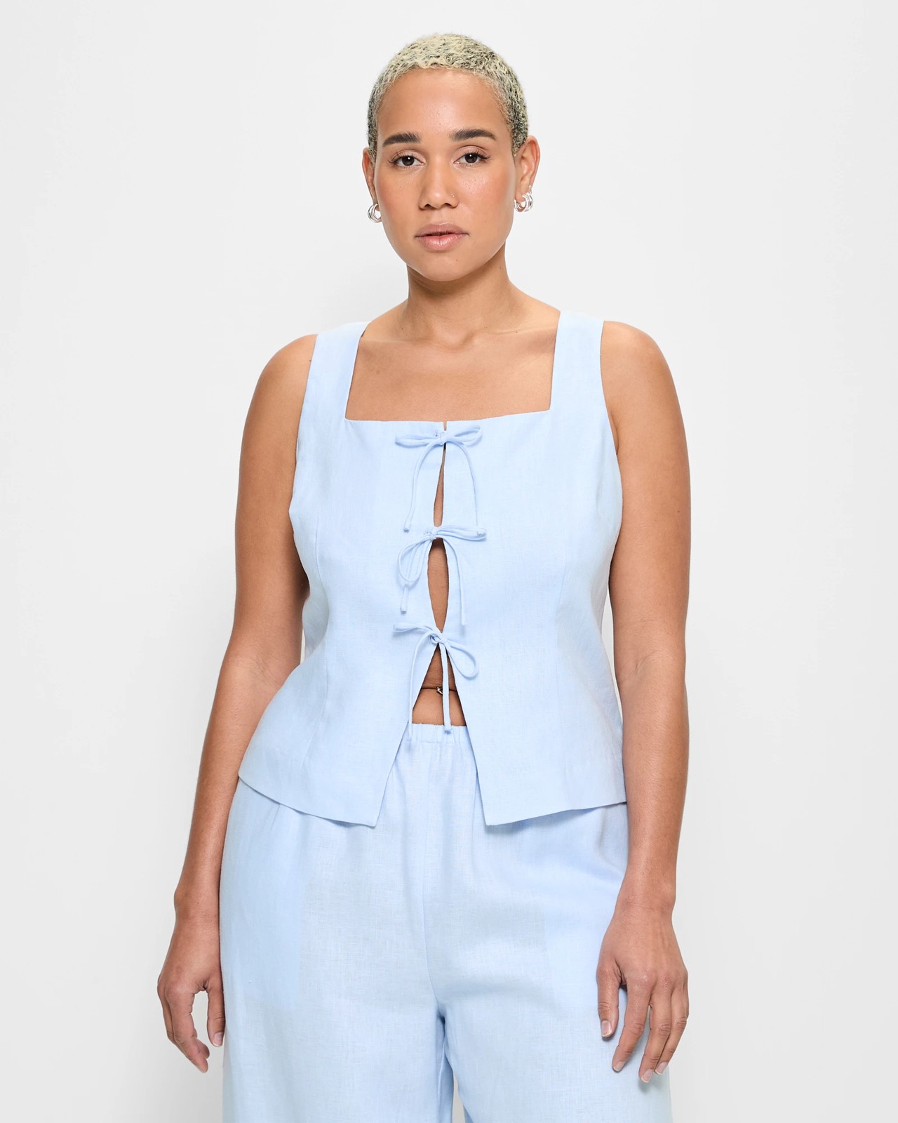Discover timeless charm with the European Linen Tie Front Waistcoat by Lily Loves. Made from exquisite linen with a cotton lining, this waistcoat ensures both comfort and style. It features a square neckline and sleeveless design, complemented by thick shoulder straps and detailed darting at the chest for an impeccable fit. The three centre ties add a refined touch, while the panelling throughout offers a tailored look. Ideal for layering, it can also be worn open for a more casual appearance. Add this versatile piece to your collection today.