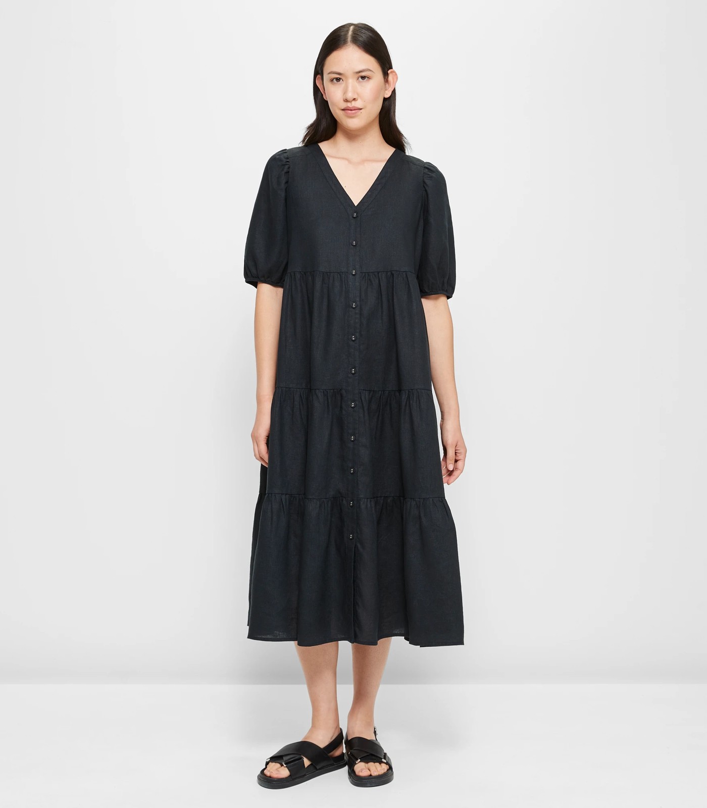Step into elegance with our European Linen Tiered Midi Dress. Crafted from a luxurious linen blend, the dress offers a flattering silhouette with a V-neckline and structured underbust. The short puff sleeves and gathered panels add a touch of sophistication, making you feel confident and stylish for any occasion. Embrace the comfort of European linen and experience the perfect balance of chic design and ease. Elevate your wardrobe with a piece that exudes charm and grace.
