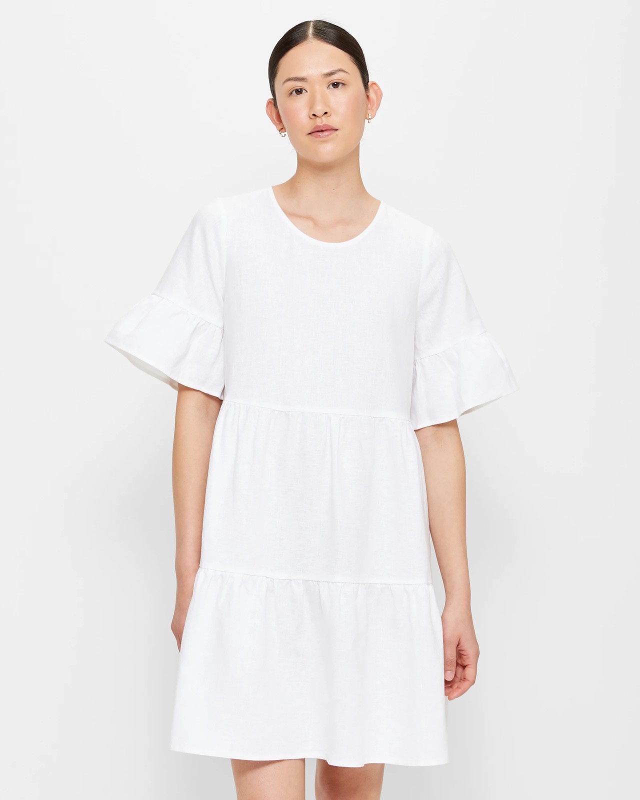 A great lightweight design for everyday wear, the European linen tiered mini dress has a round neckline with a back button closure, short sleeves with a large ruffle hem, tiered bottom panels and a mini length.