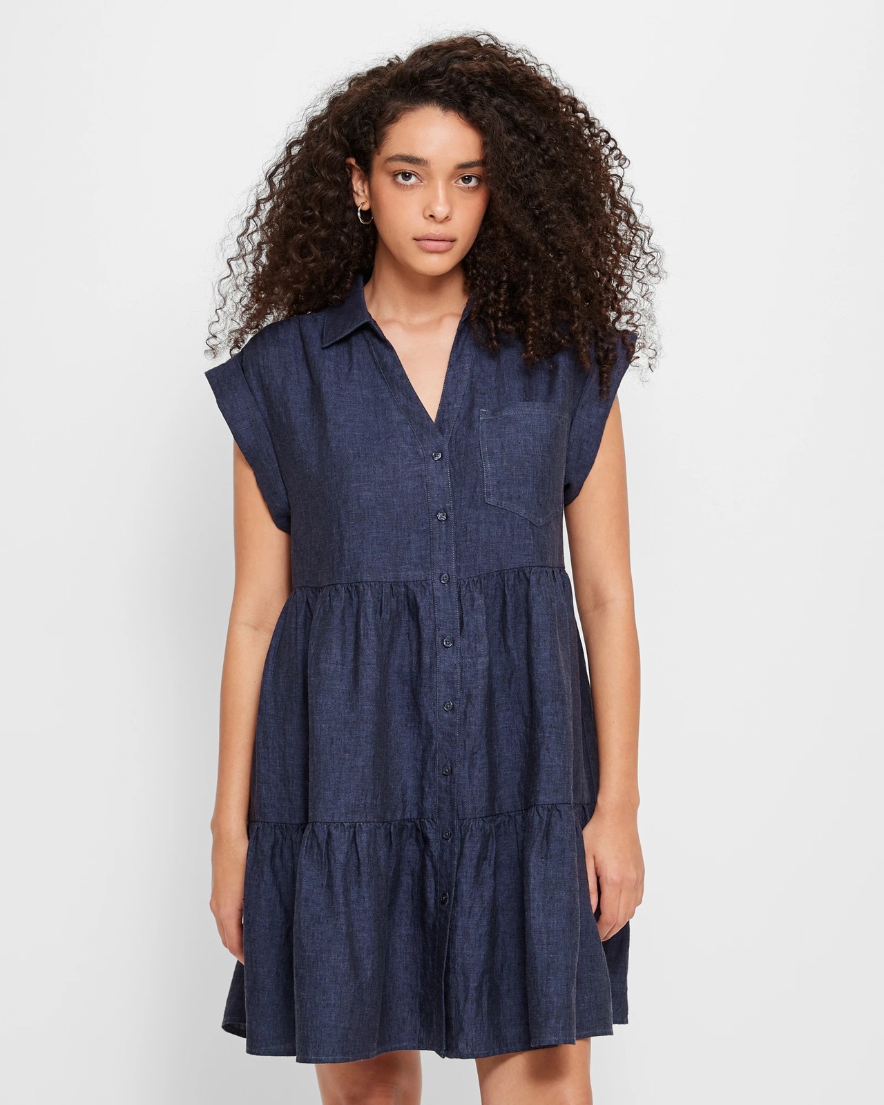 Introducing our European Linen Tiered Mini Dress, a must-have addition to your wardrobe. Made from a high-quality European linen fabrication, this dress is lightweight and breathable, perfect for warm summer days. With its regular fit, navy cross dye colour, and round collared neckline with a front v-drop, this dress offers both style and comfort. The gathering down the shoulders and short thick cuff sleeves add a touch of femininity and elegance. Featuring a button through front, open chest pocket, structured waist, and gathering under the waist, this dress accentuates your figure in all the right places. The tiered bottom panel and straight hemline complete the look, creating a chic and stylish mini-length dress and showcasing the versatility of this dress for various body types. Make a statement and embrace a fashion-forward look with our European Linen Tiered Mini Dress. Get yours now!
