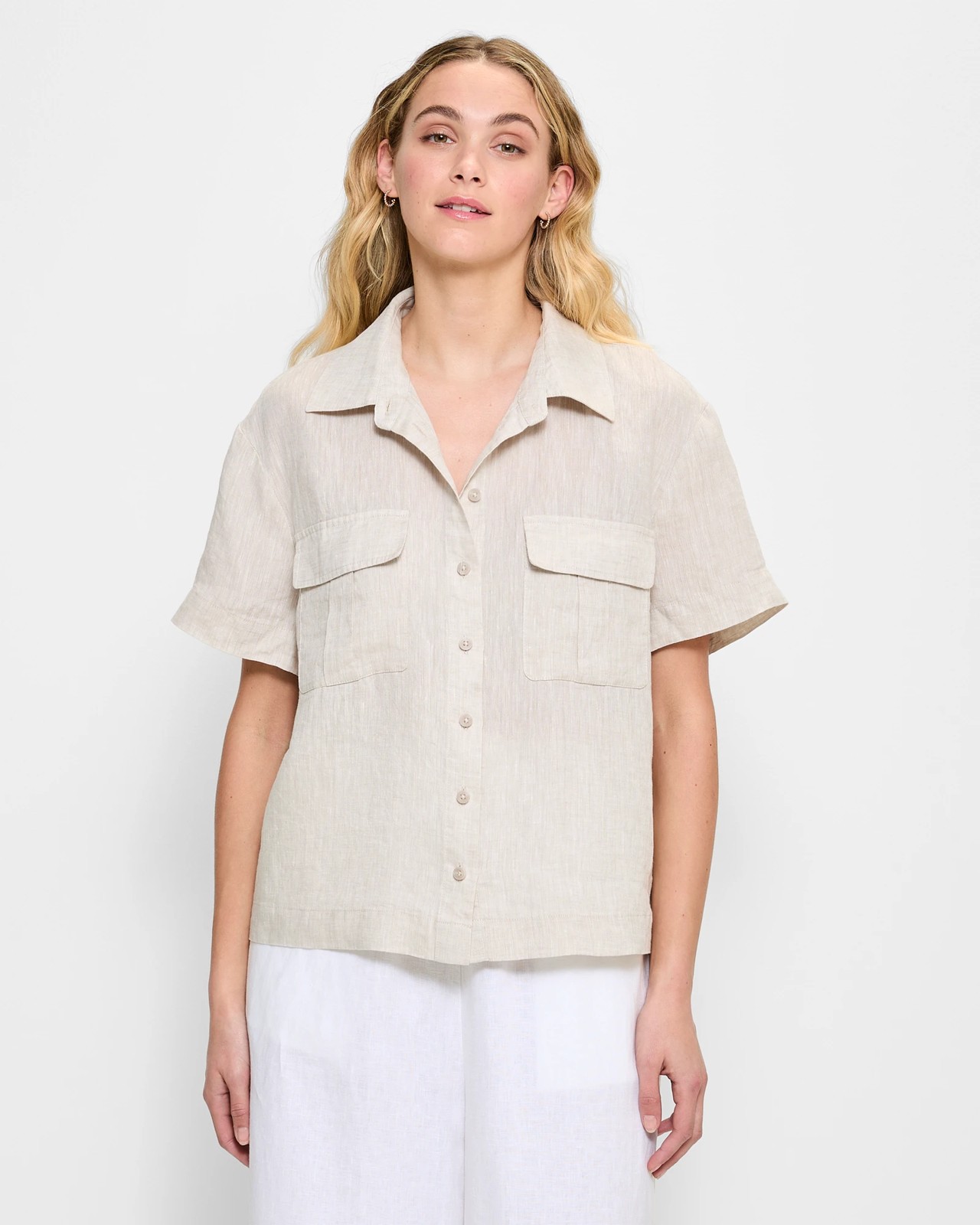 Embrace effortless style with the European Linen Utility Cropped Shirt. This women's top is made from fine European linen, guaranteeing a light and airy feel. It features a relaxed fit and timeless utility design, complete with a round collar and button-through front. The short sleeves and chest pockets add a practical flair, perfect for everyday wear. With a straight hemline and back centre pleat, this shirt ensures ease of movement. Step up your wardrobe game with this versatile and fashionable piece today.