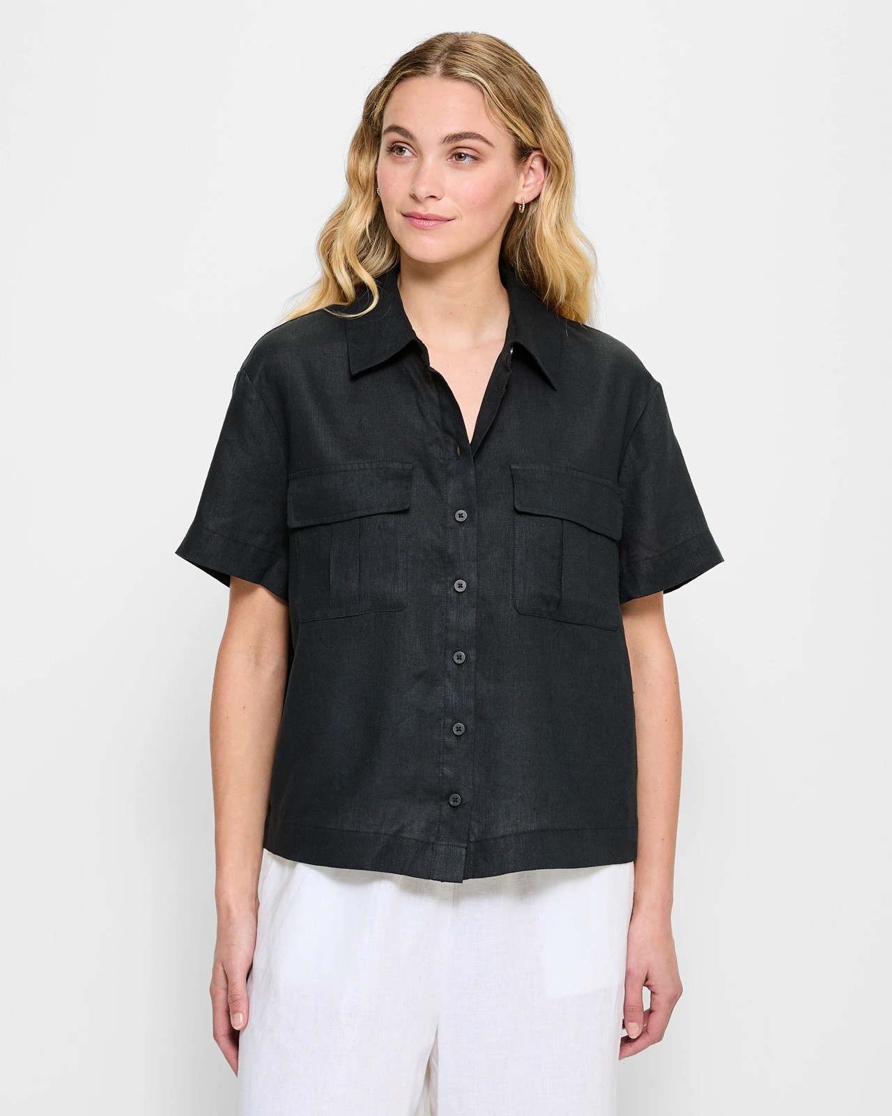 Embrace effortless style with the European Linen Utility Cropped Shirt. This women's top is made from fine European linen, guaranteeing a light and airy feel. It features a relaxed fit and timeless utility design, complete with a round collar and button-through front. The short sleeves and chest pockets add a practical flair, perfect for everyday wear. With a straight hemline and back centre pleat, this shirt ensures ease of movement. Step up your wardrobe game with this versatile and fashionable piece today.