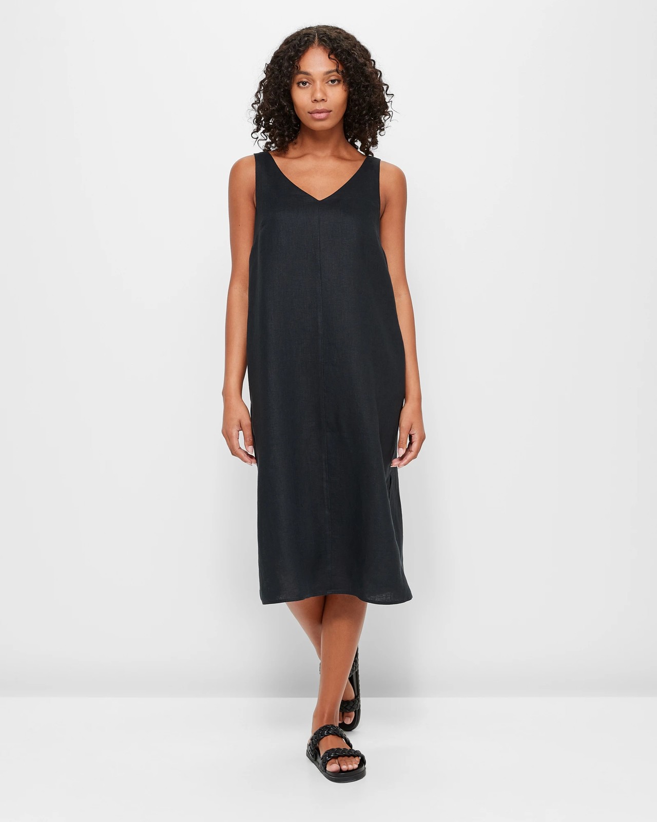 Introducing the European Linen V-Neck Midi Dress, perfect for chic summer days and warm evenings. Made from a premium European linen fabrication, this dress is lightweight and offers a flattering regular fit. The elegant black colour exudes sophistication, while the V-neckline and sleeveless design keep you cool and comfortable. The dress features thick shoulder straps and darting at the chest for added style and structure. Complete with side seam pockets and a straight hemline with side seam splits, this midi dress effortlessly combines functionality and fashion. Whether you're attending a garden party or going out for dinner, this dress is a must-have addition to your wardrobe. Choose your size and elevate your summer style today!