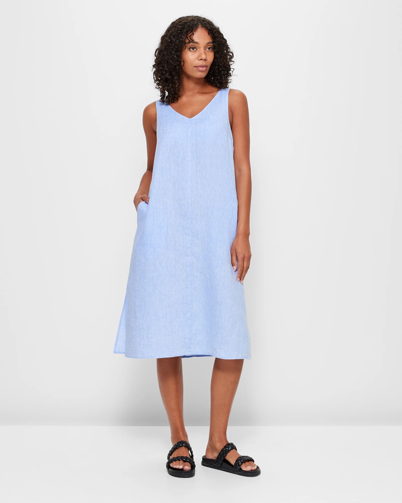 Introducing our European Linen V-Neck Midi Dress! Crafted from a high-quality linen fabric, this dress is perfect for all-day comfort. With its lightweight design and regular fit, it will keep you cool and stylish in any weather. The chambray-inspired look adds a touch of elegance, while the V-neckline and sleeveless design create a flattering silhouette. Featuring thick shoulder straps and darting at the chest, this dress offers a structured yet relaxed look. Complete with side seam pockets and a straight hemline with side seam splits, it combines functionality with trendy style. Whether you're attending a special occasion or just enjoying a day out, this midi dress is a must-have wardrobe staple. Shop now and embrace the effortless charm of European linen!