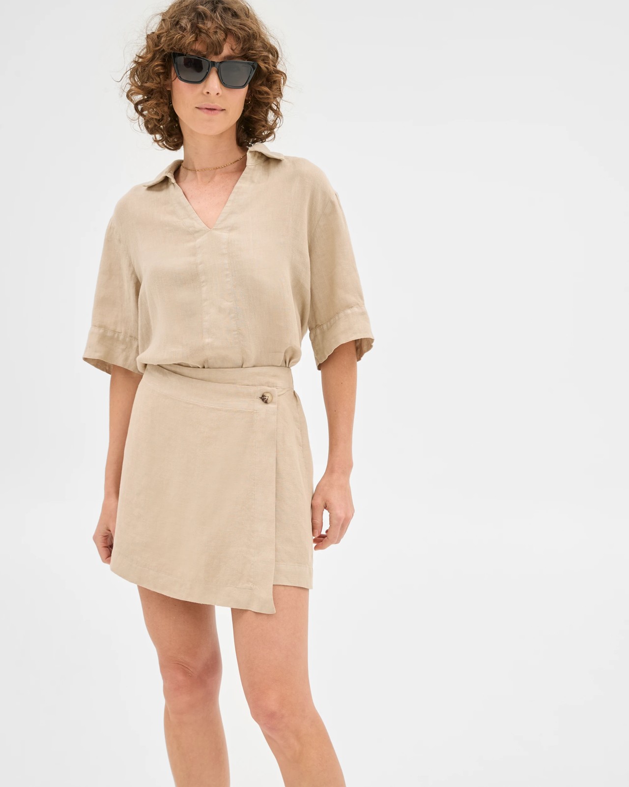 Enjoy everyday comfort and style with this European Linen Skort for women. This delightful piece features a breezy linen blend that helps you stay cool and fresh, especially on sunny days. The neat front overlap and side button detail bring modern flair, while the structured front with an elasticated back waistband means you can simply slip it on for a perfect fit. Sitting at a mid-rise waist and shorter length, it's a brilliant choice for warm days out or relaxed get-togethers. Pair it with anything you fancy for an easy, polished look that fits effortlessly into your wardrobe.