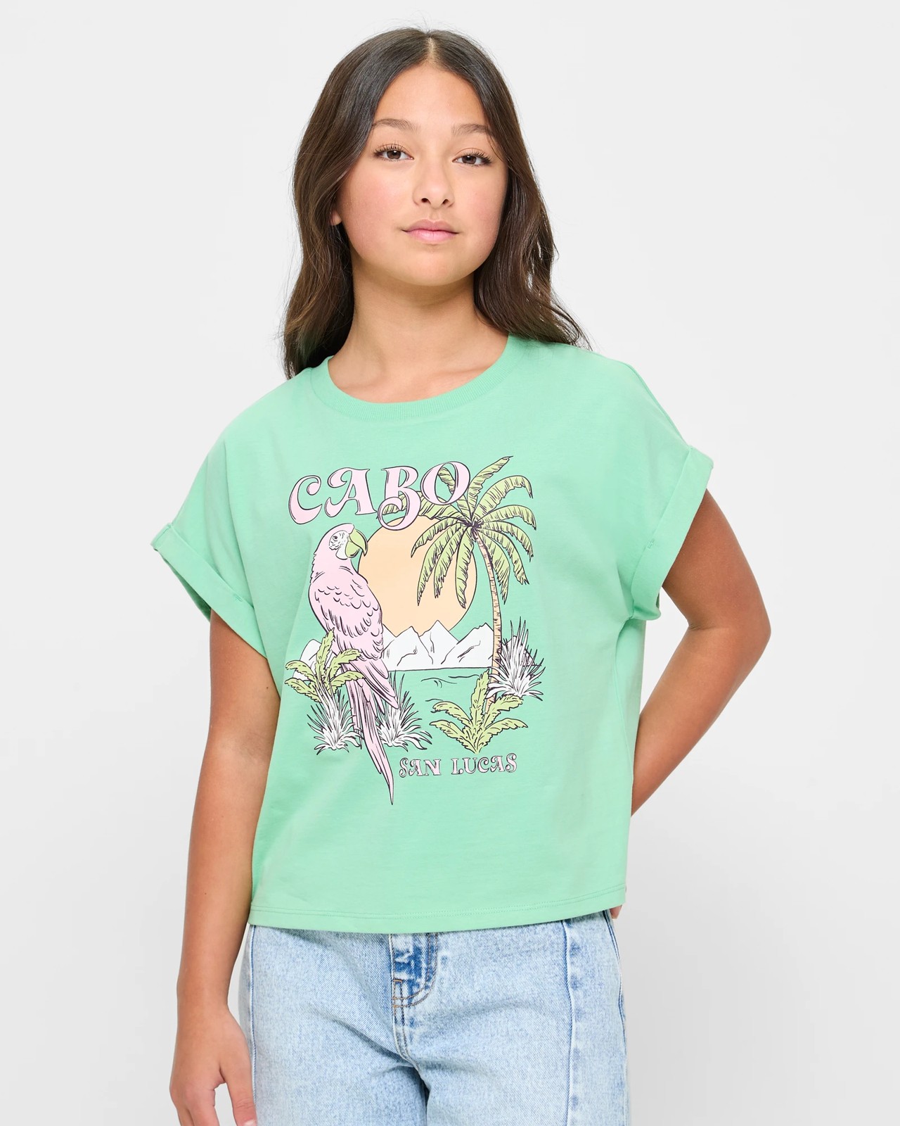 Step up her fashion game with this Extended Shoulder T-shirt! Made from soft cotton, this t-shirt features a relaxed fit that guarantees all-day comfort. The ribbed crew neck and turned cuffs add a touch style, while the striking large graphic print on the front makes a bold statement. Whether out with friends or lounging at home, this tee is perfect for any occasion.