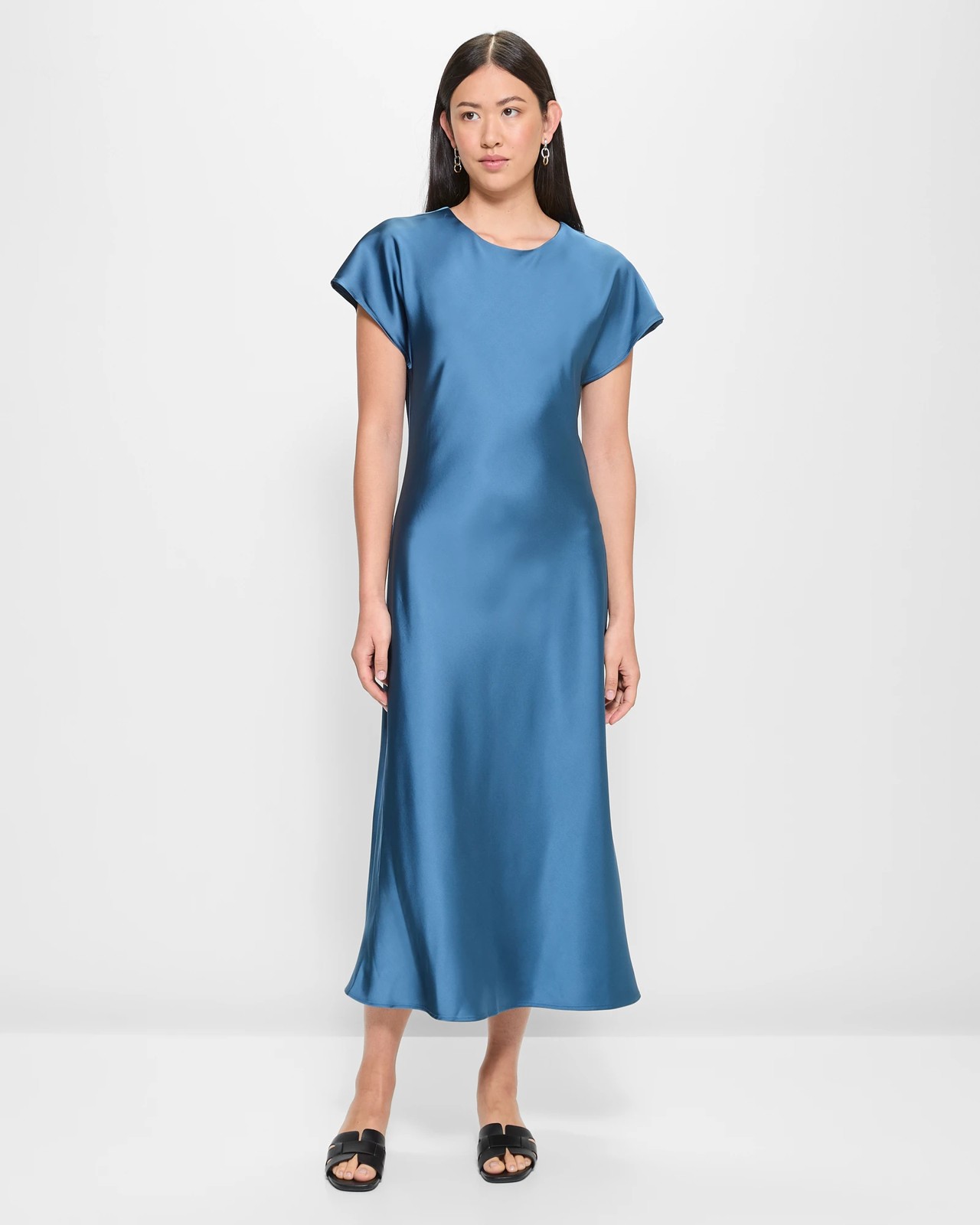 Experience the elegance of the Extended Sleeve Satin Midi Dress. Created with a luxurious polyester blend, its fabric ensures comfort while containing recycled materials. Boasting a seamless satin finish, the slim fit design accentuates your figure. The crew neckline and extended short sleeves add a unique touch, flowing into a chic midi length with a straight hemline. Complete with a sophisticated back button closure and keyhole detail. Elevate your wardrobe with the perfect blend of style and class.