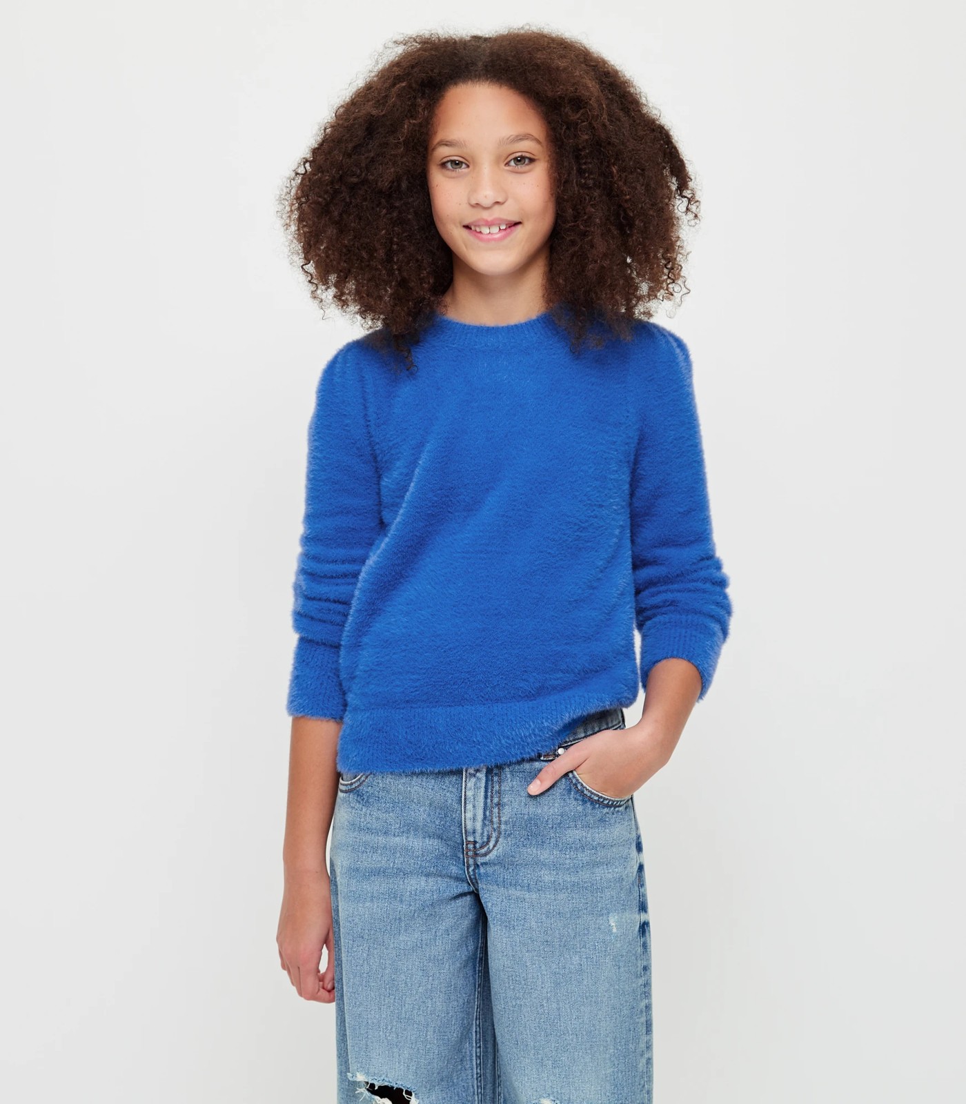 Introducing the perfect addition to any wardrobe, the Eyelash Jumper! Crafted from soft to touch eyelash knit fabric, this gorgeous girls' jumper features a classic crew neck, long sleeves and a straight hem. Available in a beautiful blue hue, this jumper is sure to be a staple in her wardrobe. Get ready for cozy days in style with the Eyelash Jumper!