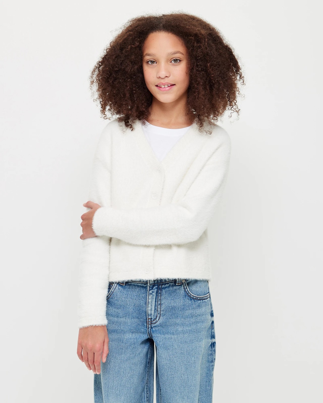 The Eyelash Knit Cardigan is the perfect addition to any wardrobe. Crafted from a soft polyamide knit, this cardigan offers a regular fit with a V neckline and long sleeves. The straight hemline and button up front complete the look of this classic cardigan. Available in a crisp white hue, this cardigan is sure to become an essential in any girl's wardrobe.