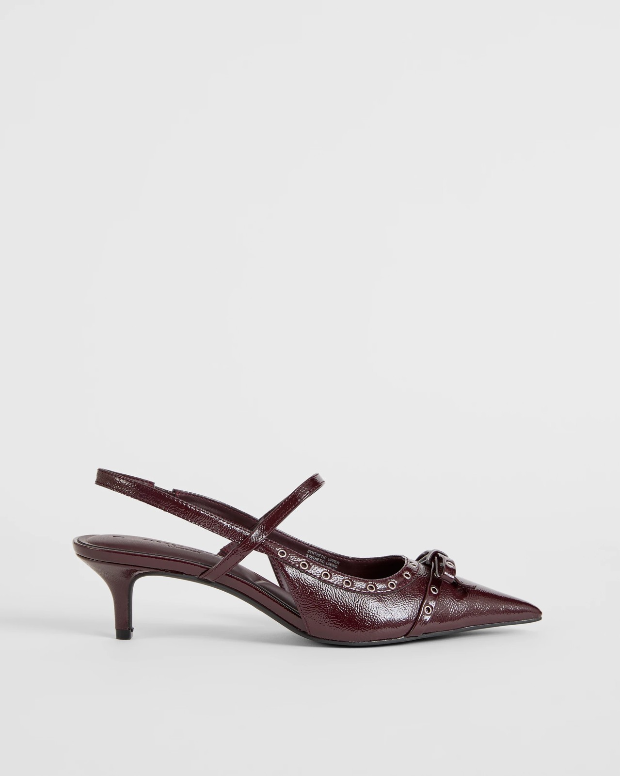 Upgrade your outfit with the Eyelet Sling Back Kitten Heel, a stylish choice designed for modern women who value both fashion and comfort. Highlighted by a sleek pointed toe and a charming bow detail with eyelet accents, these heels add a refreshing twist to classic looks. The supportive upper strap and sling back ankle strap help keep every step secure, while the LuxeBase high density contoured insole provides delightful cushioning throughout the day or night. With their gracefully shaped kitten heel and synthetic sole, these shoes help you make an impression without sacrificing comfort. Step out and let your confidence shine in these standout heels.