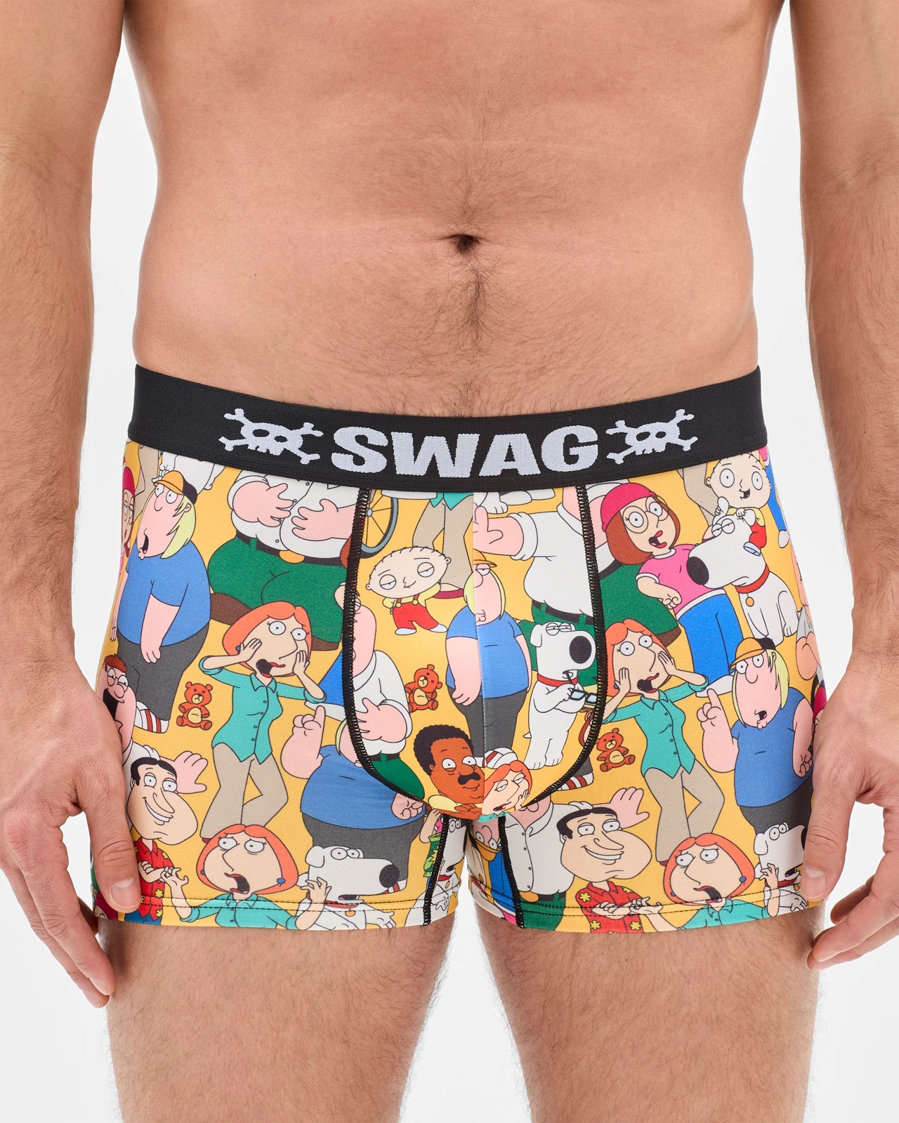 Bring a dose of fun to your essentials with these Family Guy trunks, made from a soft micropolyester blend that feels gentle against your skin. The trunks offer just the right amount of stretch with added elastane, ensuring comfort all through your day. Their slim fit and bold all-over Family Guy print add a unique touch, making you feel good beneath your clothes for any occasion. The trunks feature a smooth satin waistband and a shaped pouch for extra support, with a short leg length for a modern look. Add these lively trunks to your drawer and make getting dressed a little more exciting.
