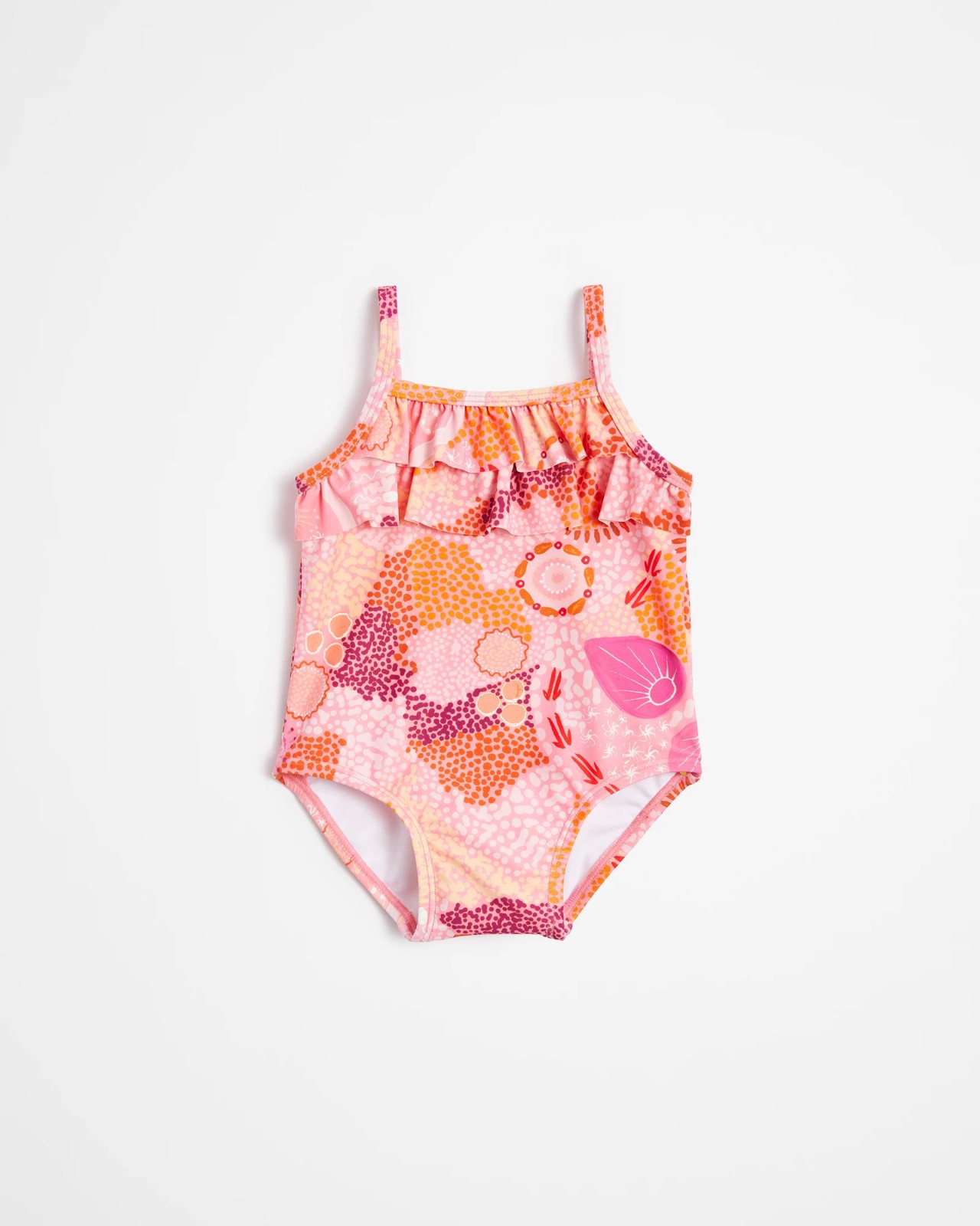 Crafted using recycled materials, these swimsuits offer great stretch and a comfortable regular fit. The all-over Cungelella Art print adds an eye-catching touch, while the strappy double frill detailing brings a playful vibe. Fully lined for added comfort, these swimsuits are sure to make a splash! Complete the look with matching family Cungelella Art print products, available separately. Dive into unforgettable family fun today!