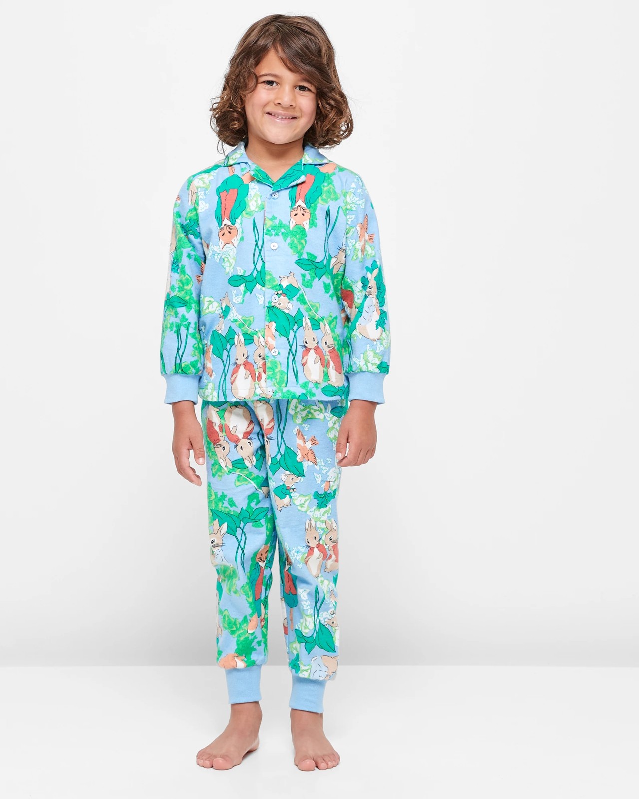 Introducing our Family Matching Boys Peter Rabbit Cotton Flannelette Pyjama Set. This delightful sleep set is perfect for cosy nights and sweet dreams. Made from soft cotton flannelette, it offers a regular fit for ultimate comfort. The set includes a collared shirt with long sleeves and ribbed cuffs, featuring a charming blue all over Peter Rabbit print. The button-up front adds a touch of style, while the straight hem ensures a neat look. The matching pants have an elastic waistband and ribbed cuffs for a secure fit. Get your family ready for bedtime with this adorable pyjama set, and enjoy sweet cuddles and storytime together. Order now and create special moments with Peter Rabbit!