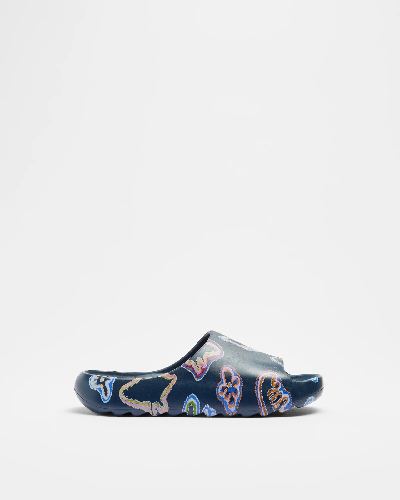 Step into summer fun with our Family Matching Boys Youth Pool Slides, featuring a vibrant Warlukurlangu print! These easy slip-on slides boast a comfortable textured footbed and EVA moulded sole, making them perfect for all his poolside adventures. Pair them with our matching swimwear (sold separately) for a coordinated family look that’s sure to turn heads. Great for everyday wear, these slides are stylish and practical. Don't miss out on these comfortable and fashionable slides - order him a pair today!