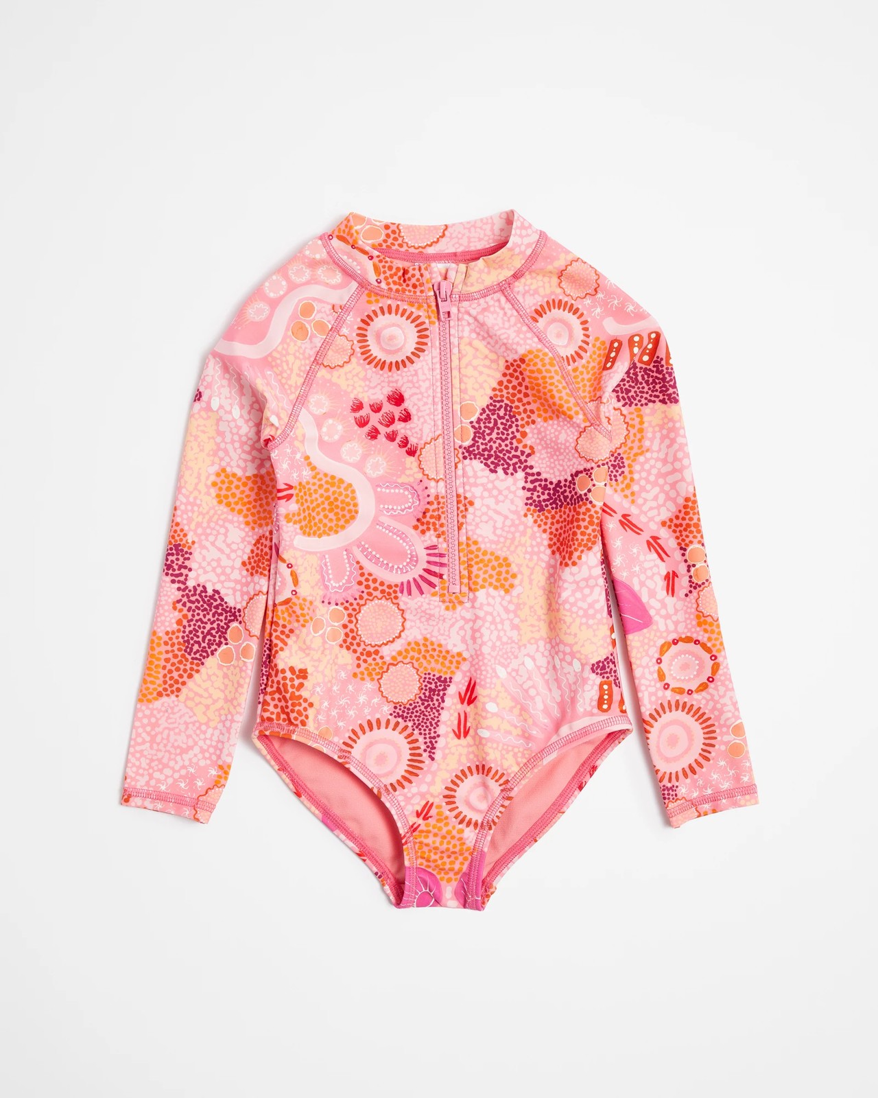 Introducing our Family Matching Girls Junior Swimsuit - Cungelella Art! This fabulous swimsuit not only looks great, but also offers excellent UPF 50+ sun protection. It's crafted using recycled materials, making it an eco-friendly choice that you can feel good about. The regular fit, pink all over Cungelella Art print, and stand collar give it a stylish and trendy look. With long raglan sleeves, this swimsuit allows for a full range of movement in the water. The zip front makes it easy to put on and take off, while the fully lined interior ensures comfort and durability. Don't forget, there's also a matching family print set available, so you can all look fabulous together! Get ready for some fun in the sun with this amazing swimsuit!