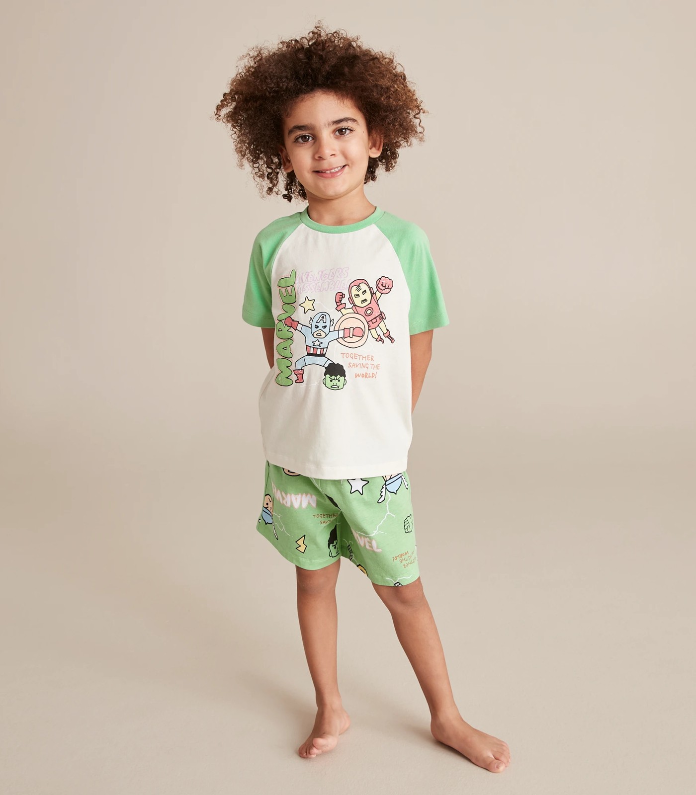 Make bedtime fun for the whole family with the Target Family Matching Kids Marvel Pyjama Set! This 2-piece set is made from soft, breathable cotton and features a ribbed crew neck with short raglan sleeves and an elastic waistband for a comfortable fit. The Marvel print to the front adds a playful touch and all-over print shorts complete the look. It's perfect for snuggling up in front of a movie or getting ready for a good night's sleep. Get ready to have some fun between the sheets with this must-have pyjama set!