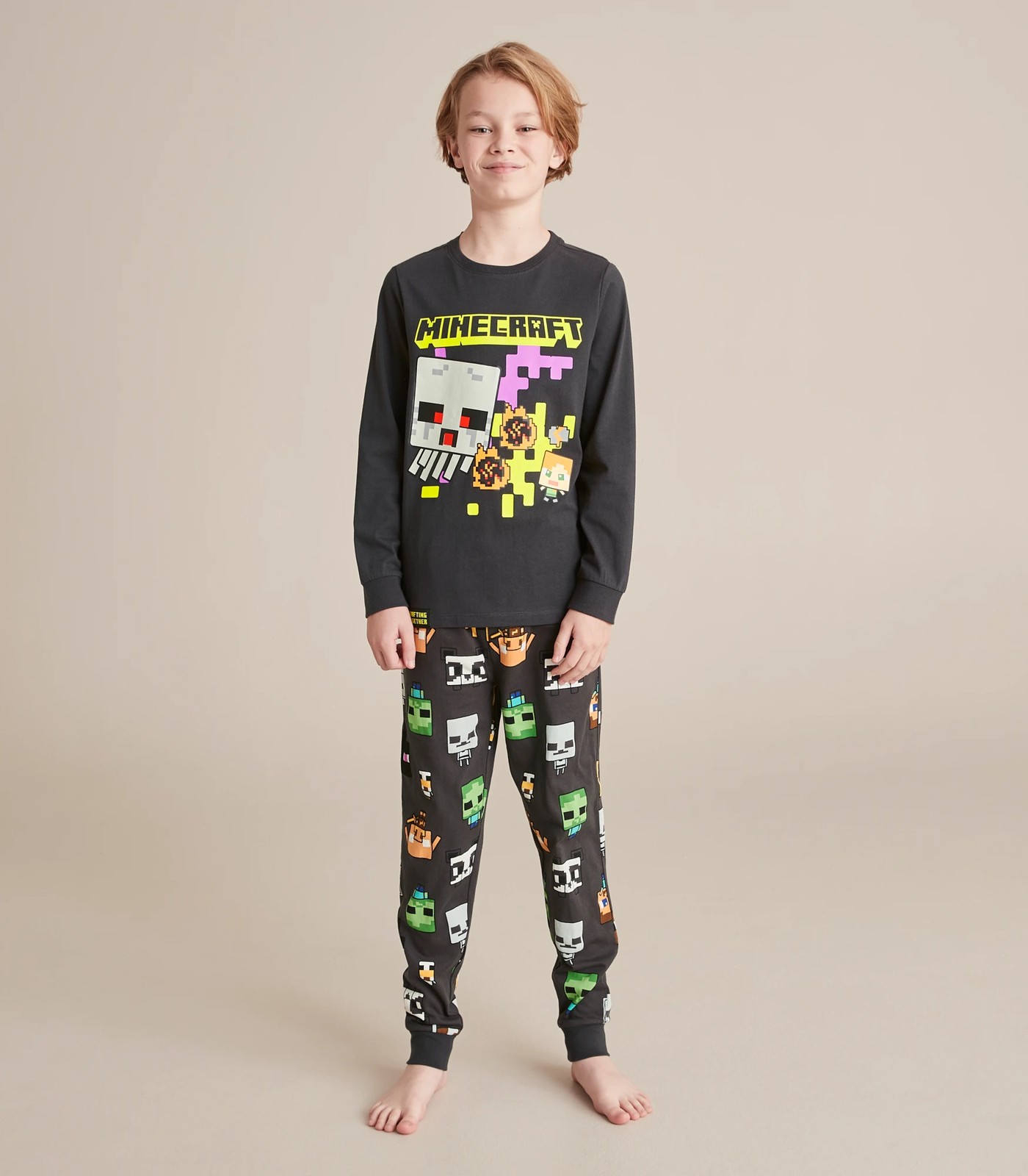 Make bedtime more fun for the whole family with Target's Family Matching Kids Minecraft Cotton Pyjama Set! This two piece set includes a ribbed crew neck top with long sleeves and a large print on the front. The all over print pants feature an elastic waistband and cuffed ankles. Perfect for boys, this black pyjama set will make sure everyone is ready for a cozy night in!