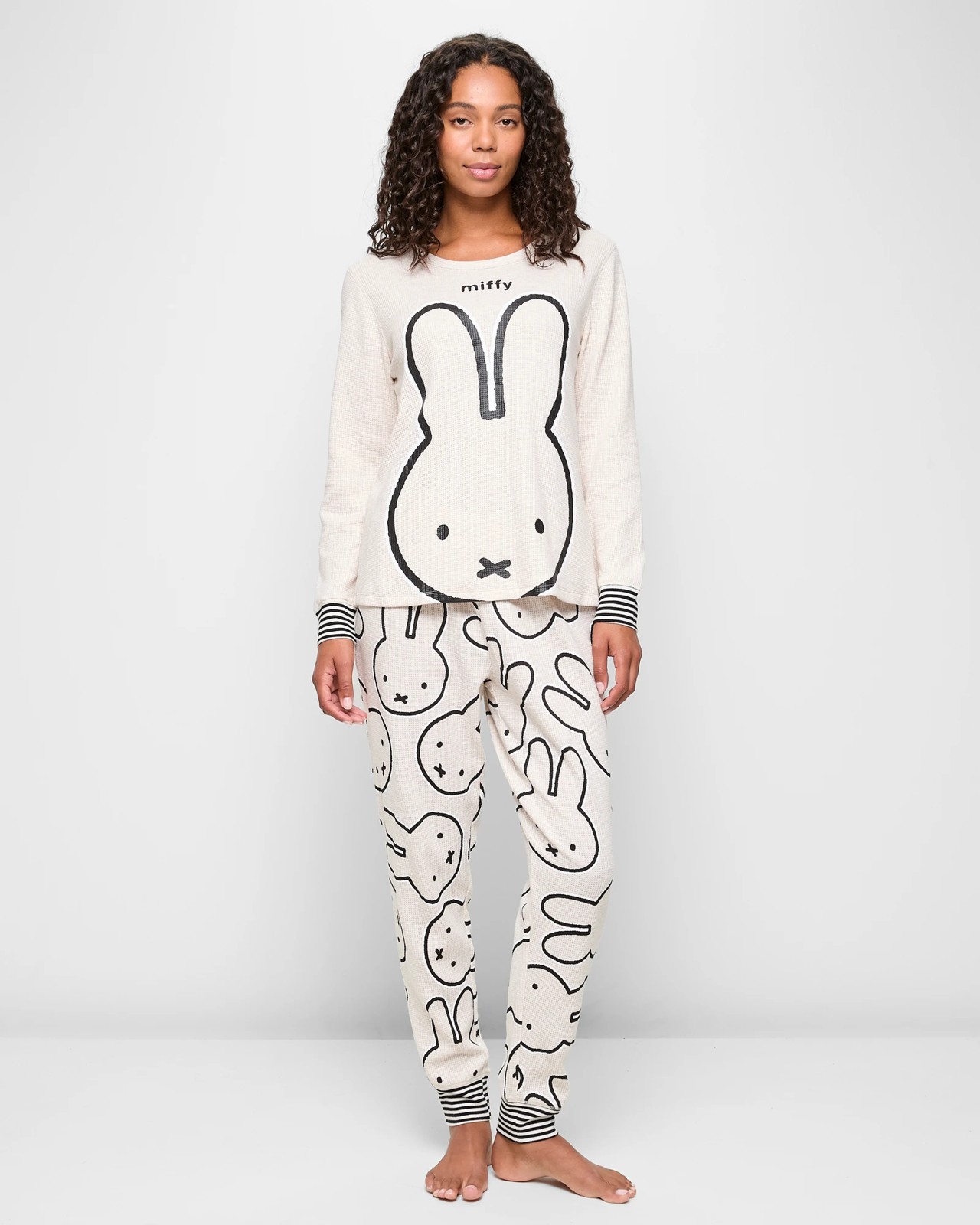 Embrace cosy nights with our Family Matching Miffy Women's Waffle Pyjama Set. Made from soft cotton with a gentle stretch, this two-piece set offers a regular fit perfect for comfort. Featuring an adorable Miffy print on the top and matching all-over Miffy pants, you'll love lounging around. An elastic waistband ensures a secure fit, while long sleeves with striped cuffs provide extra warmth. Ideal for creating heartwarming family moments, these pyjamas are available for the whole family separately, so everyone can join in the fun. Shop now to add a bit of whimsy to your nights in.