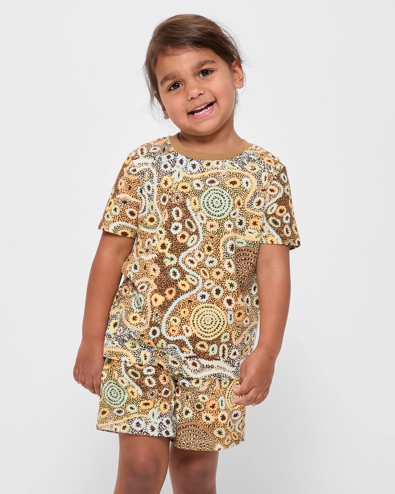 Dress your little ones in the comfort of cotton with our unisex kids pyjama set, featuring captivating Warlukurlangu prints. This two-piece set offers a regular fit, with a ribbed crew neck and short sleeves for easy wear. The straight hem and elastic waistband provide added comfort while the matching shorts complete the look. Perfect for cosy nights and lazy mornings, you can even coordinate with the whole family as matching sets are available separately. Don't miss out on adding this charming and comfortable pyjama set to your child's bedtime routine!