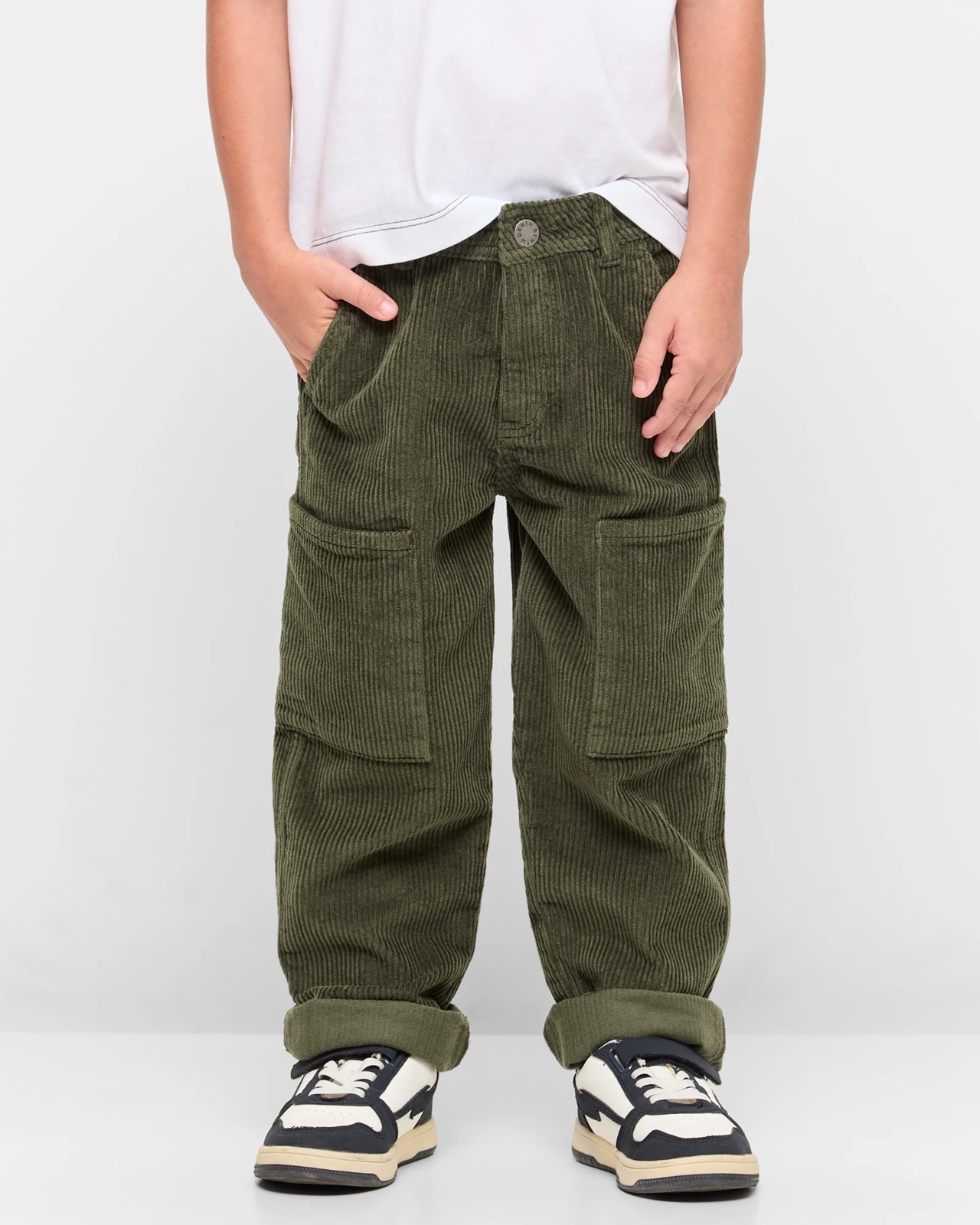 Introducing our Fashion Cord Cargo Trousers, a stylish addition to any young lad's wardrobe. Made from soft cotton corduroy, these trousers feature an adjustable waistband for ultimate comfort and a perfect fit. With practical elements like press stud and zip front, plus ample pocket space including side, thigh, and back pockets, your child can carry all their essentials with ease. The straight leg design with turned cuffs adds a touch of sophistication. Ideal for both casual outings and more dressed-up occasions. Get them now and boost your child's style game!