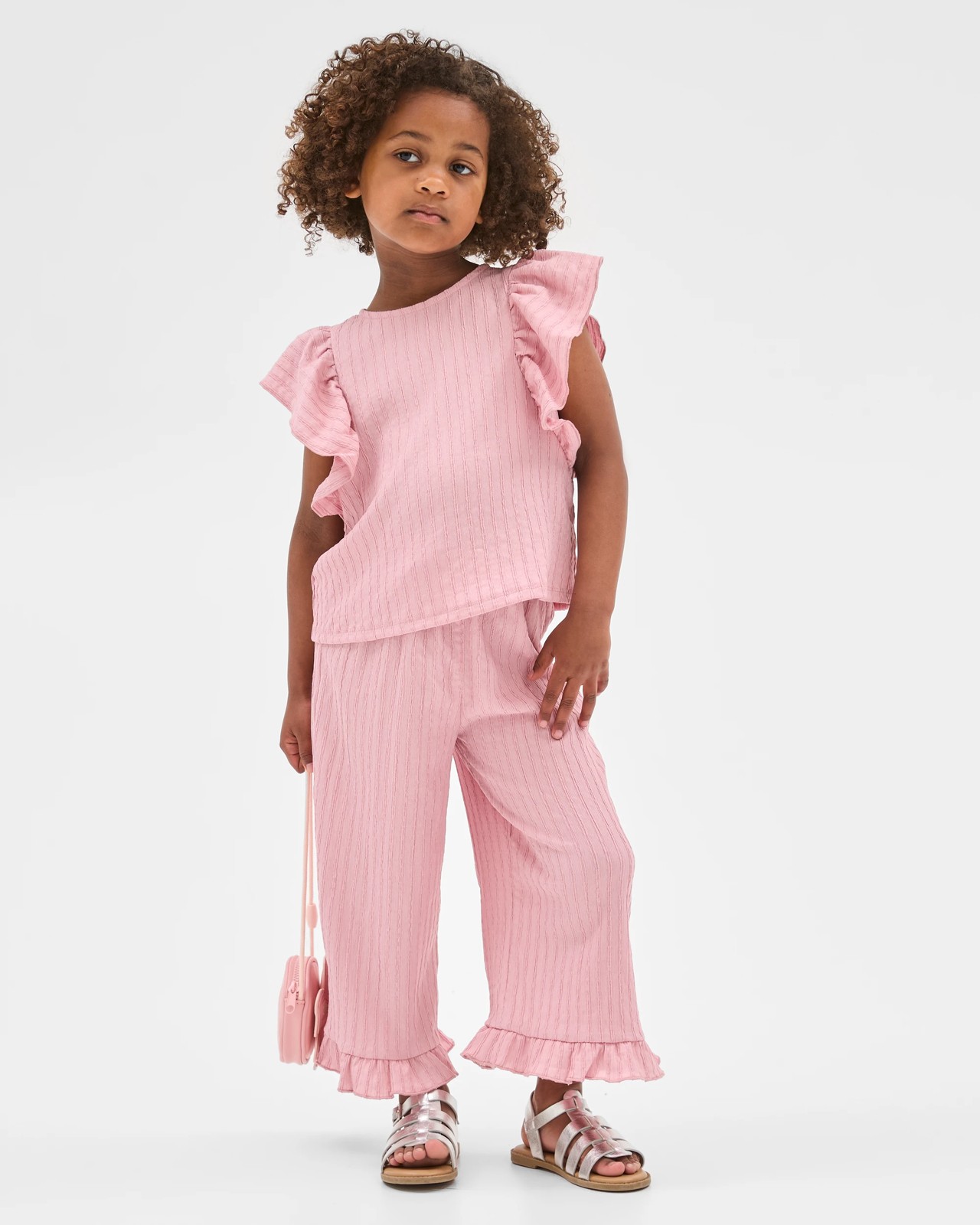Brighten up your little one's wardrobe with the Fashion Textured Tank, designed to make every day more delightful. This charming tank features a playful textured finish, offering a look and feel that's both fresh and fun for any occasion. The roomy boxy fit and touch of stretch ensure your child can move freely and stay comfy throughout the day, while the sleeveless design with sweet ruffles at the armholes adds a whimsical twist. The easy crew neck and convenient back button closure make getting dressed a breeze, perfect for busy mornings. Pair it with the matching bottoms to create a standout outfit everyone will adore. Give your child stylish comfort and confident style — add this lovely tank to your collection today.
